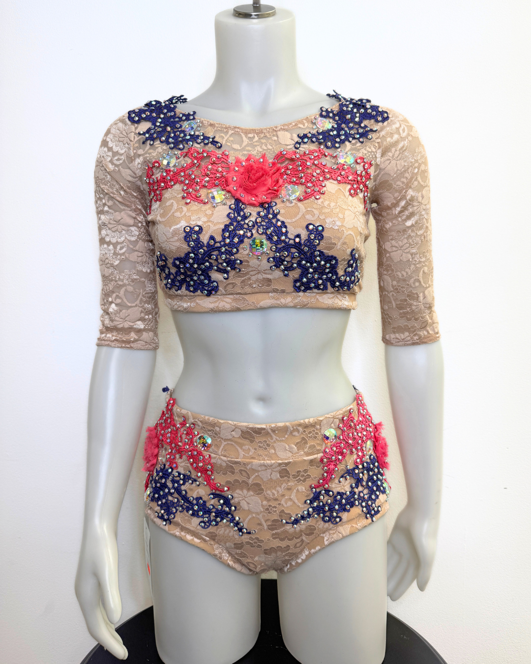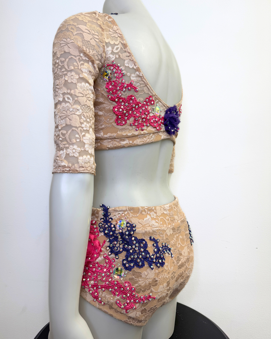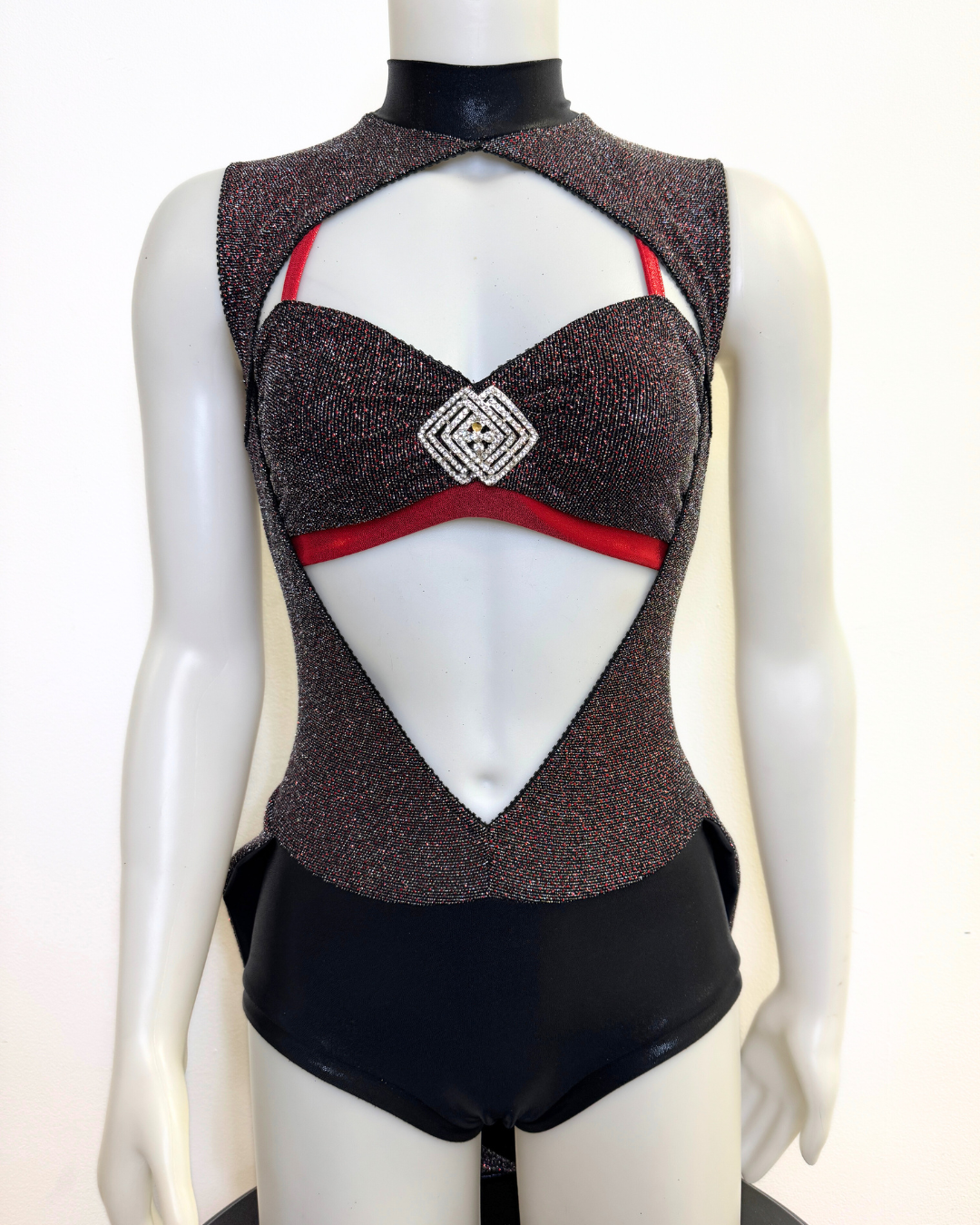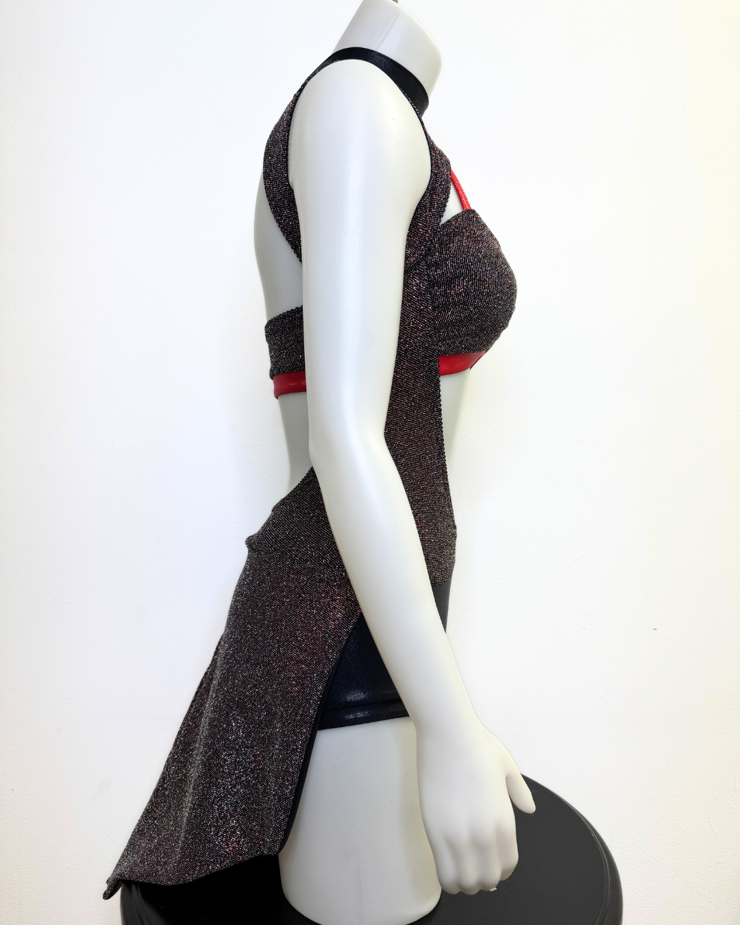 This Danznmotion two-tone crop top has mirror detailing at the front and back and features a small keyhole at chest. Perfect for dancers during class, convention or photoshoots. Fully lined front.