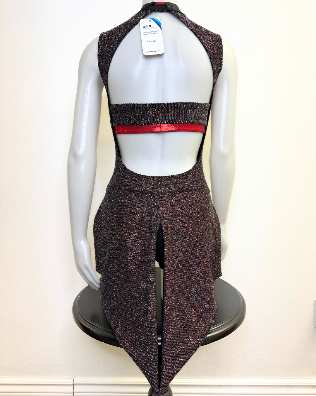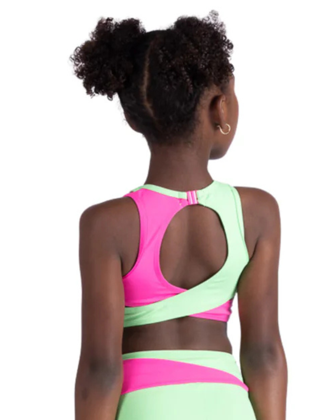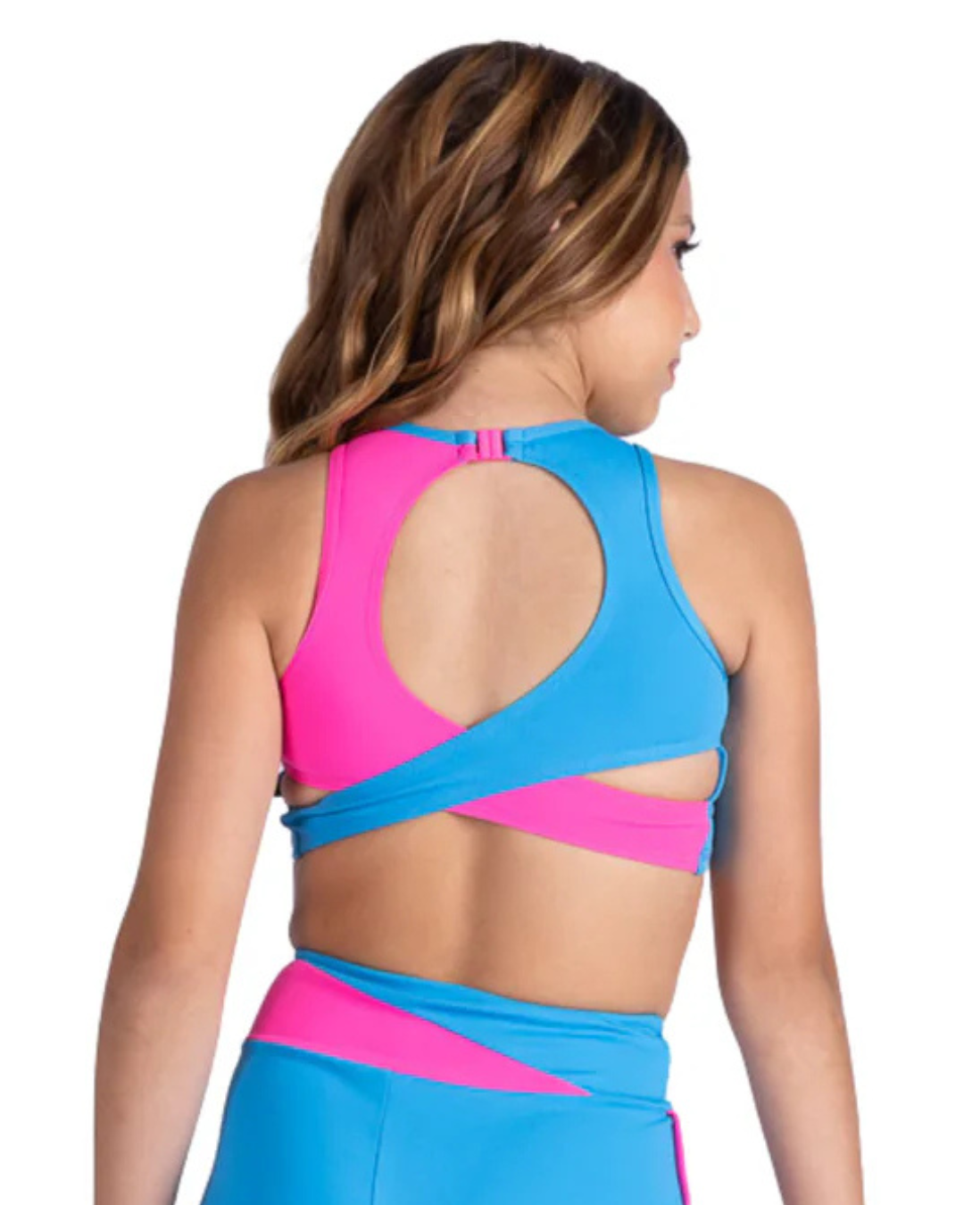 This Danznmotion two-tone crop top has mirror detailing at the front and back and features a small keyhole at chest. Perfect for dancers during class, convention or photoshoots. Fully lined front.