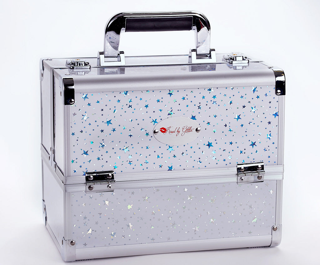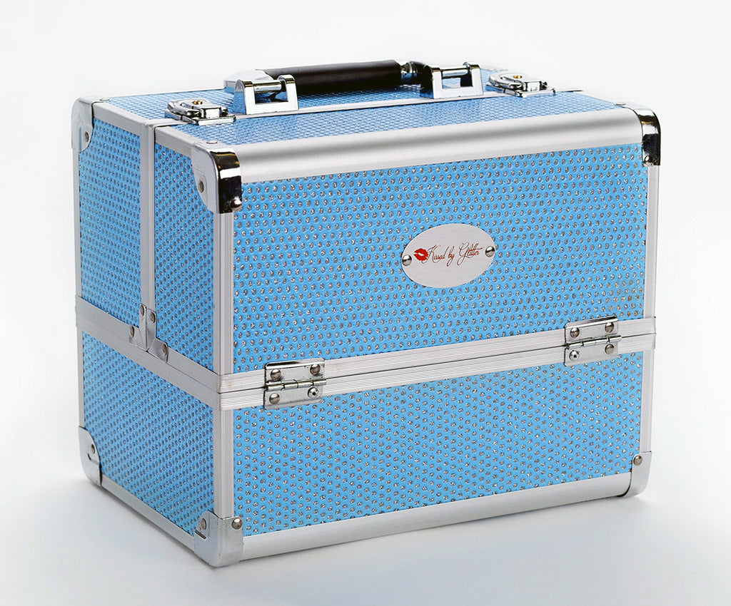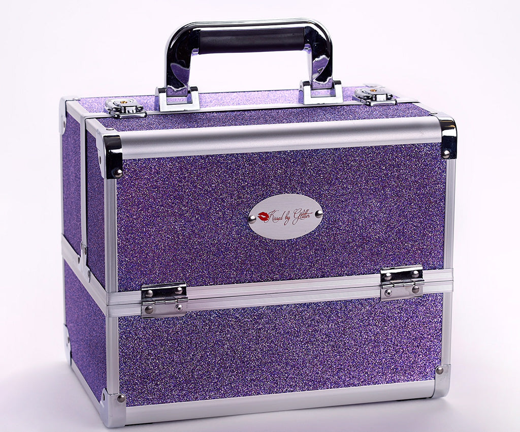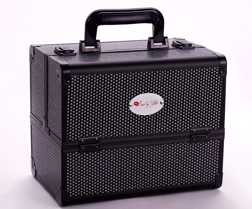 This Kissed By Glitter caboodle make up case is perfect for the competitive dancer, model, makeup artist or anyone who wants to have great organization. Sturdy construction with plastic coating and strong metal edging and hinges. The large plastic and metal handle make this case very durable and easy to carry. Lined in silky fabric, it opens center top to one of 2 interior styles.