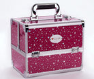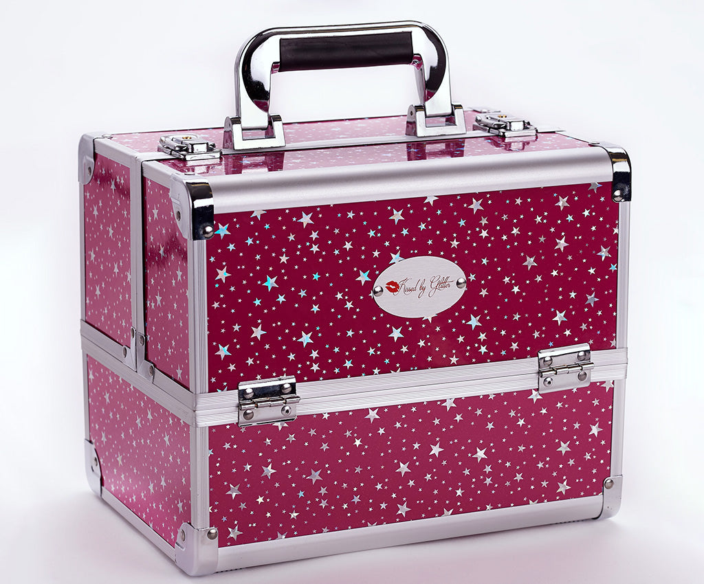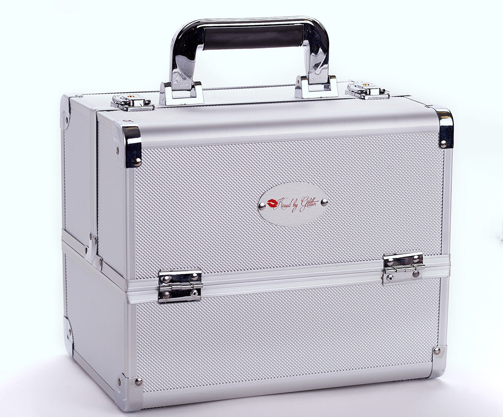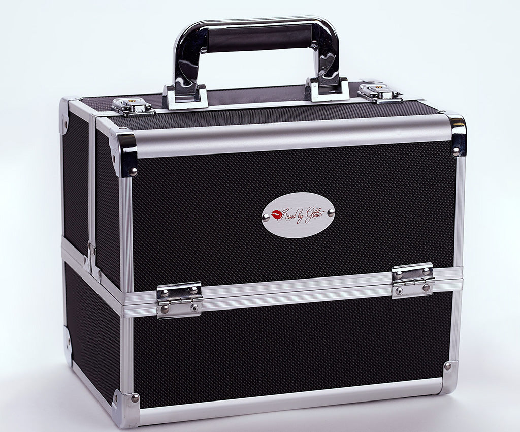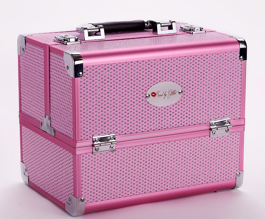 This Kissed By Glitter caboodle make up case is perfect for the competitive dancer, model, makeup artist or anyone who wants to have great organization. Sturdy construction with plastic coating and strong metal edging and hinges. The large plastic and metal handle make this case very durable and easy to carry. Lined in silky fabric, it opens center top to one of 2 interior styles.