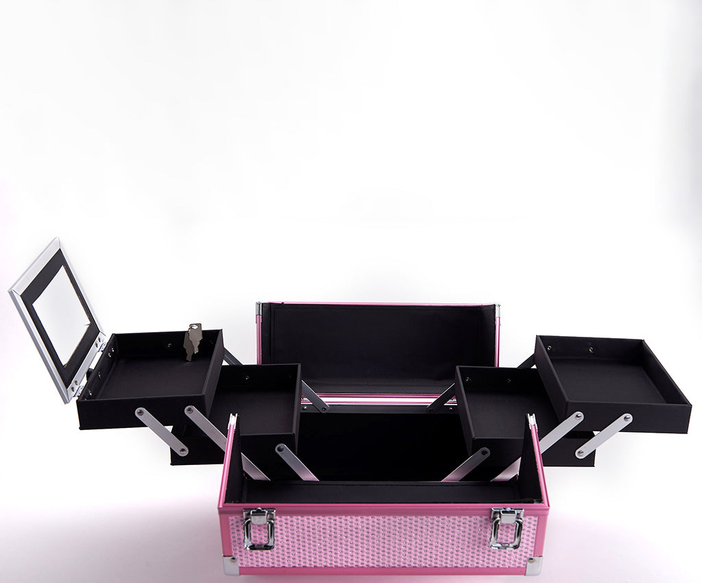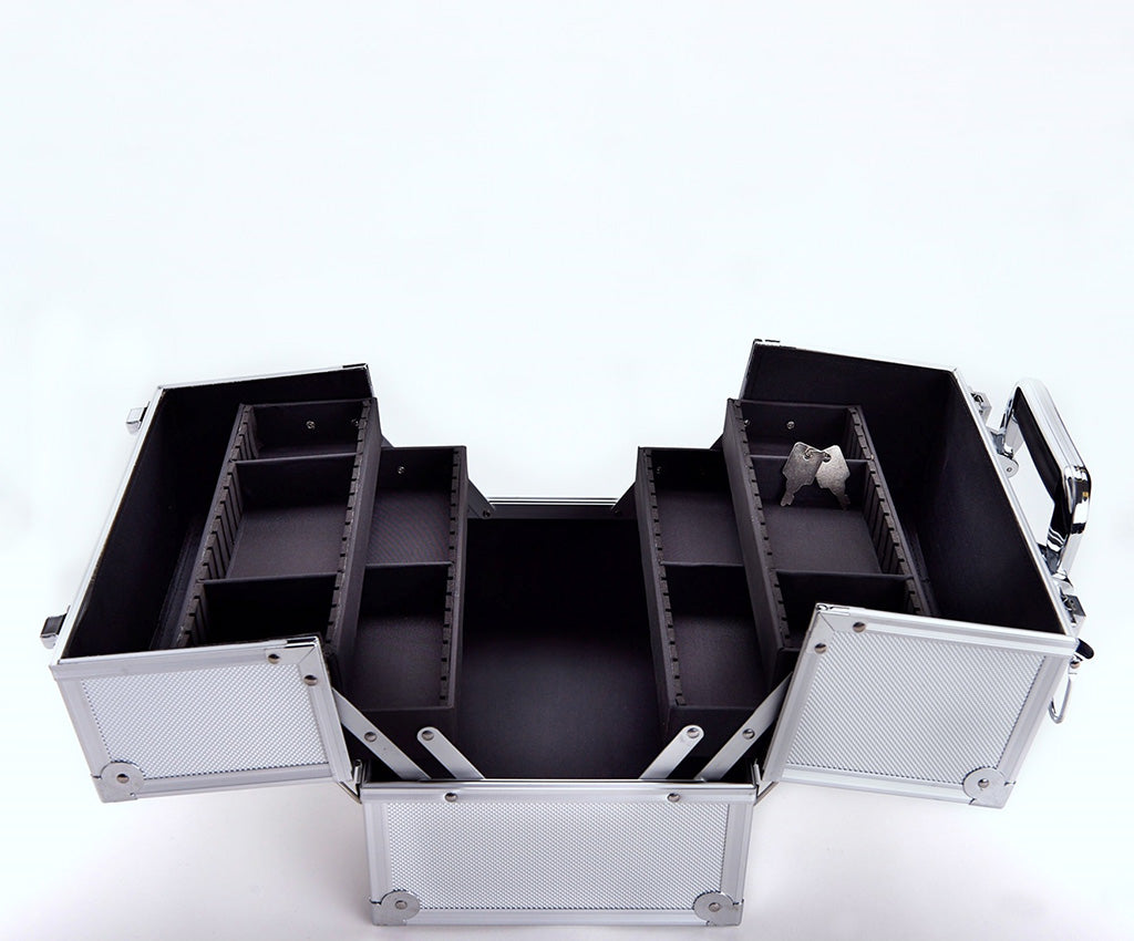 The tackle style has 4 pull out compartments 3" x 10" with 6 adjustable dividers. The mirror style has 4 pull out containers 5" X 7" and a cover on one top compartment that opens up to a mirror. Both have a roomy bottom compartment 10 1/2" x 7". With an external measurement of 11" X 8", both styles come with keys for security and can easily store all your makeup and hair products.