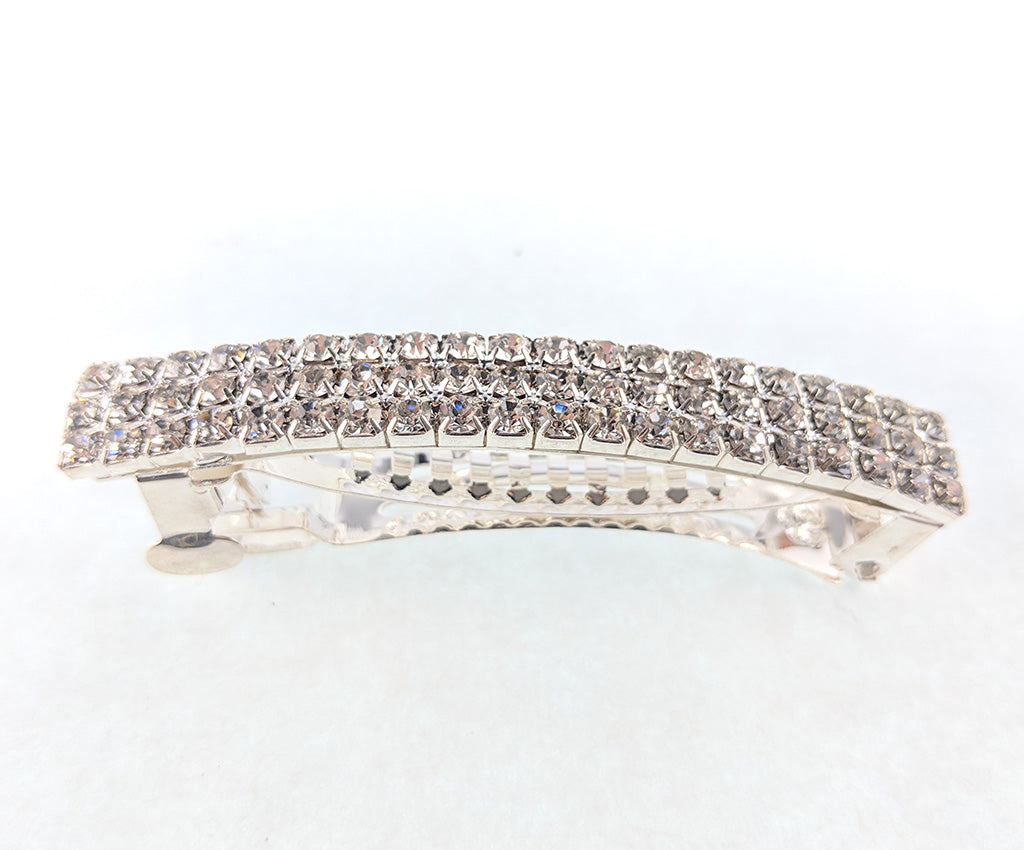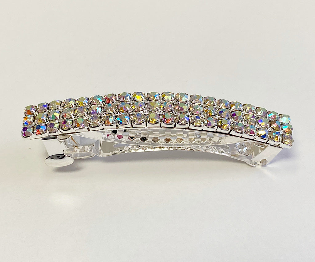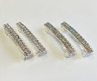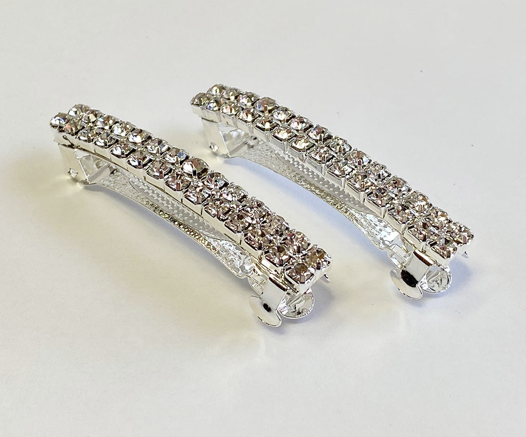 These Kissed By Glitter rhinestone and silver hair clips are the perfect sparkling addition to any costume or for any special occasion. These sturdy clips have a strong easy to release "squeeze" barrette clip on the back to hold in hair well. They come in two sizes with either crystal or AB stones.