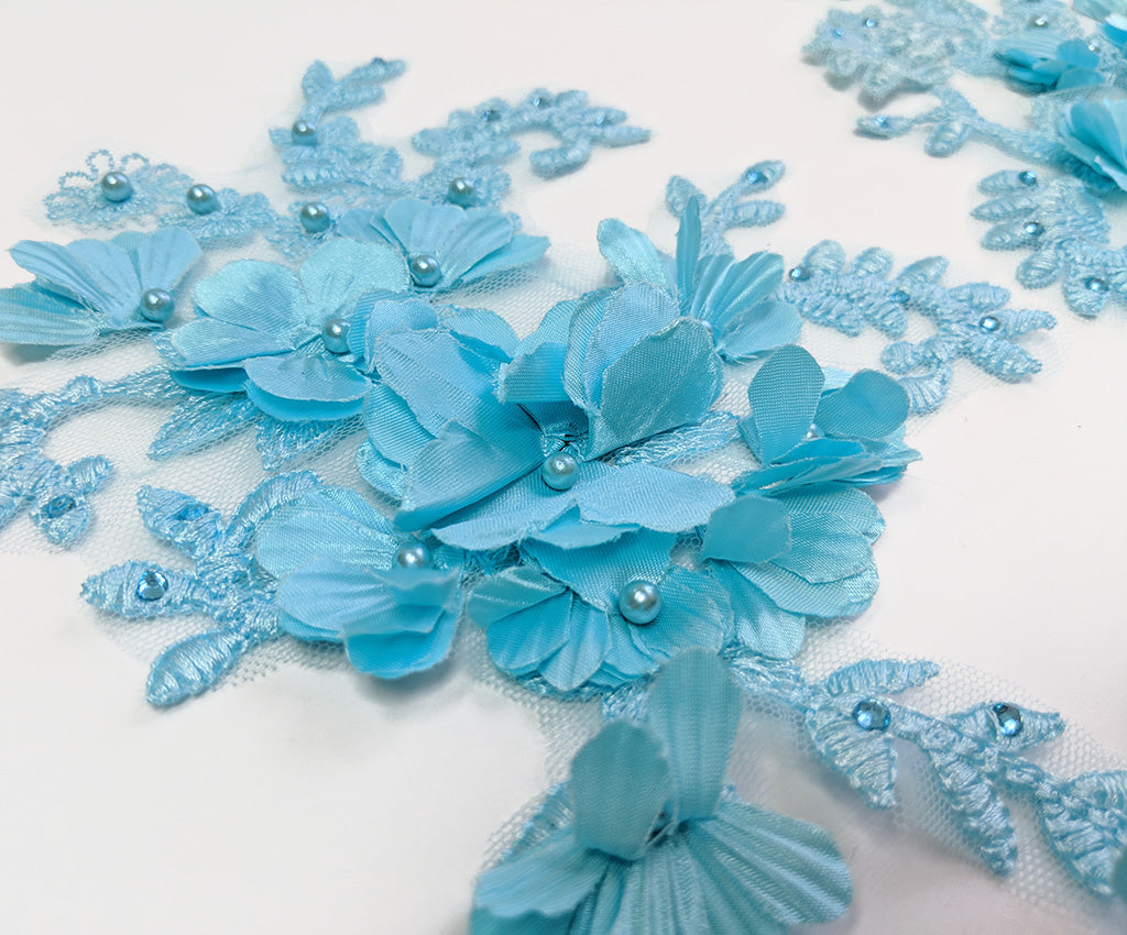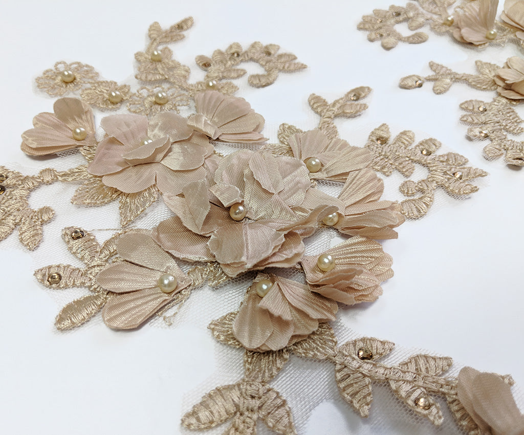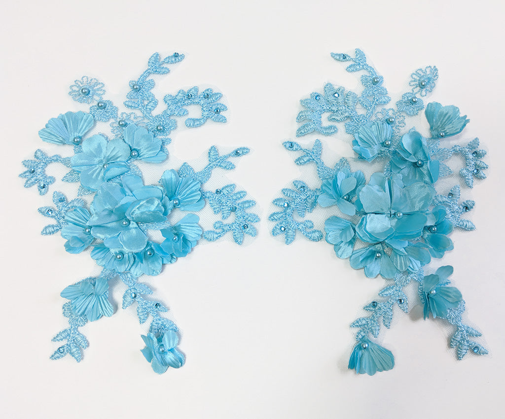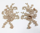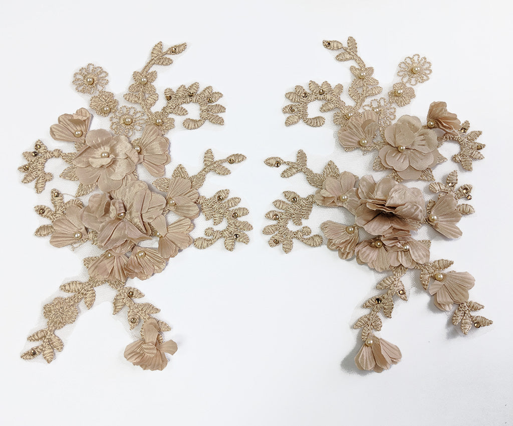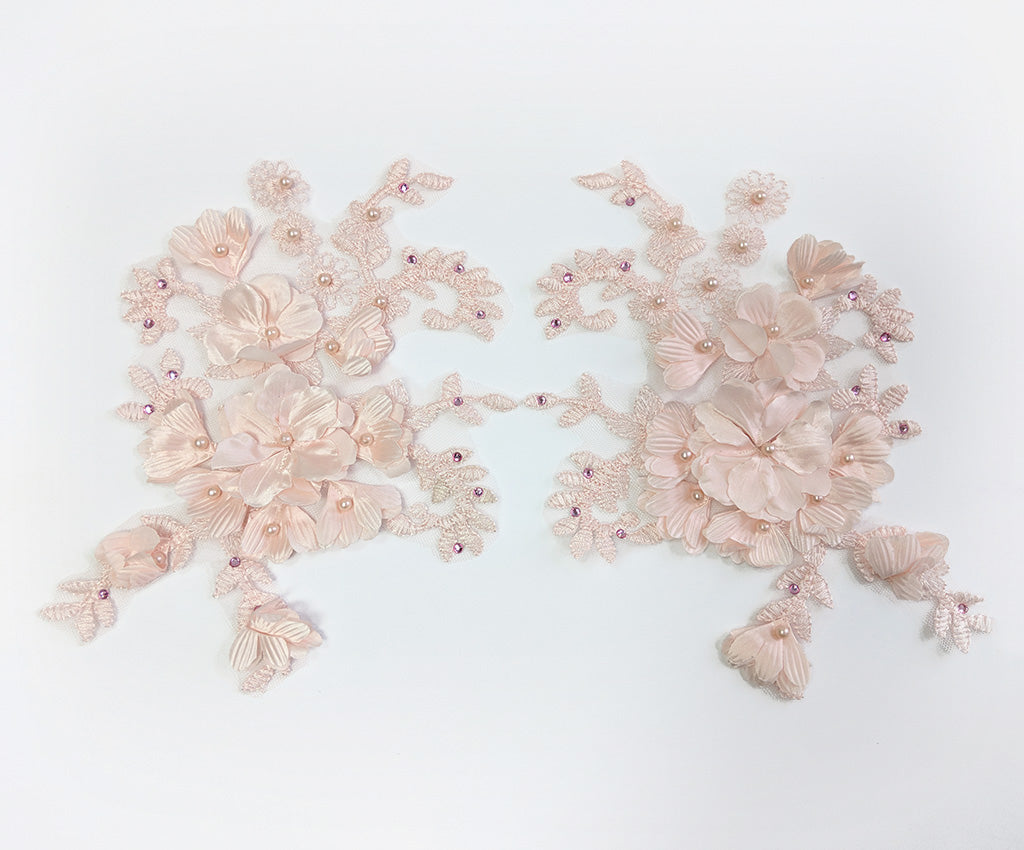 This mesh backed large lace applique has a 3 dimensional flower and embroidered satin finished leafy filigre. Detailed with matching pearls and rhinestones this elegant applique adds a special finish to any outfit. Sold as a left or right side be sure to buy one of each to get a mirrored pair or a single one if you want an asymmetric look. Approximately 9 1/4 X 6 1/2 inches each. Sold as a single piece as left or right. Be sure to order both Left & Right for a mirorred pair. Professionally packaged to protect product during shipping.