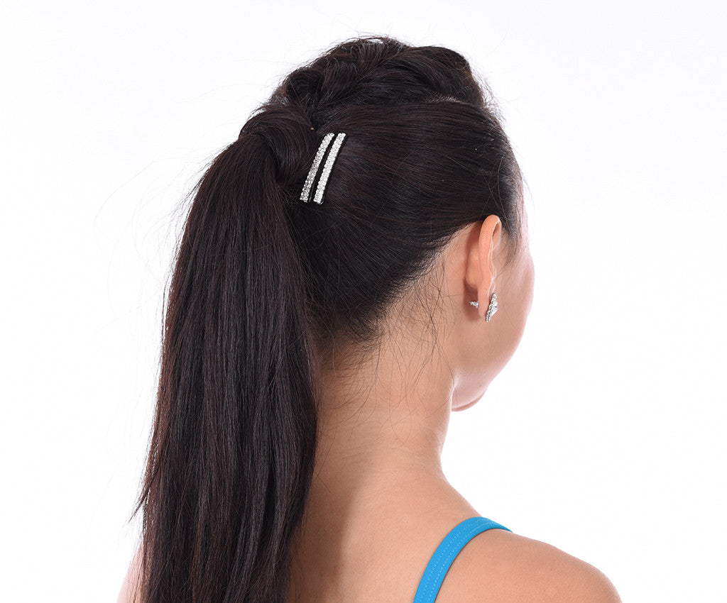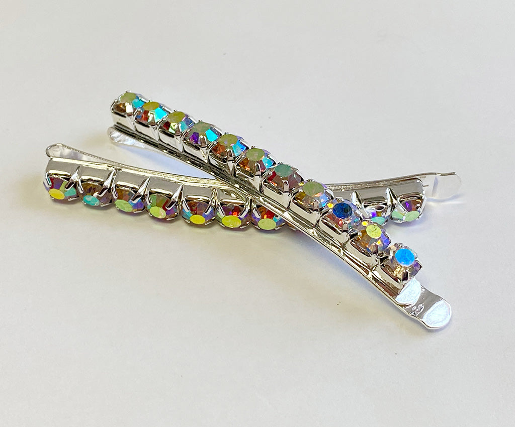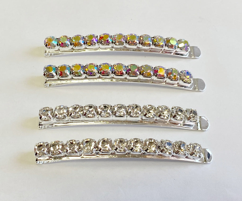These Kissed By Glitter Rhinestone and silver bobby pins are the perfect sparkling addition to any costume. Single Row of shimmering stones on a sturdy bobby pin back. They measure approximately 2 1/2 inches long and are available in Crystal or AB stones. Perfect for dancers, ballroom dancers or performers.