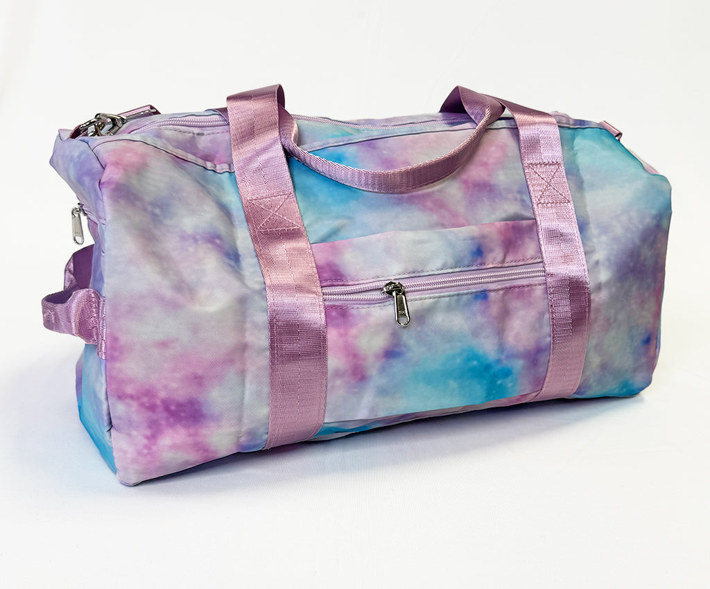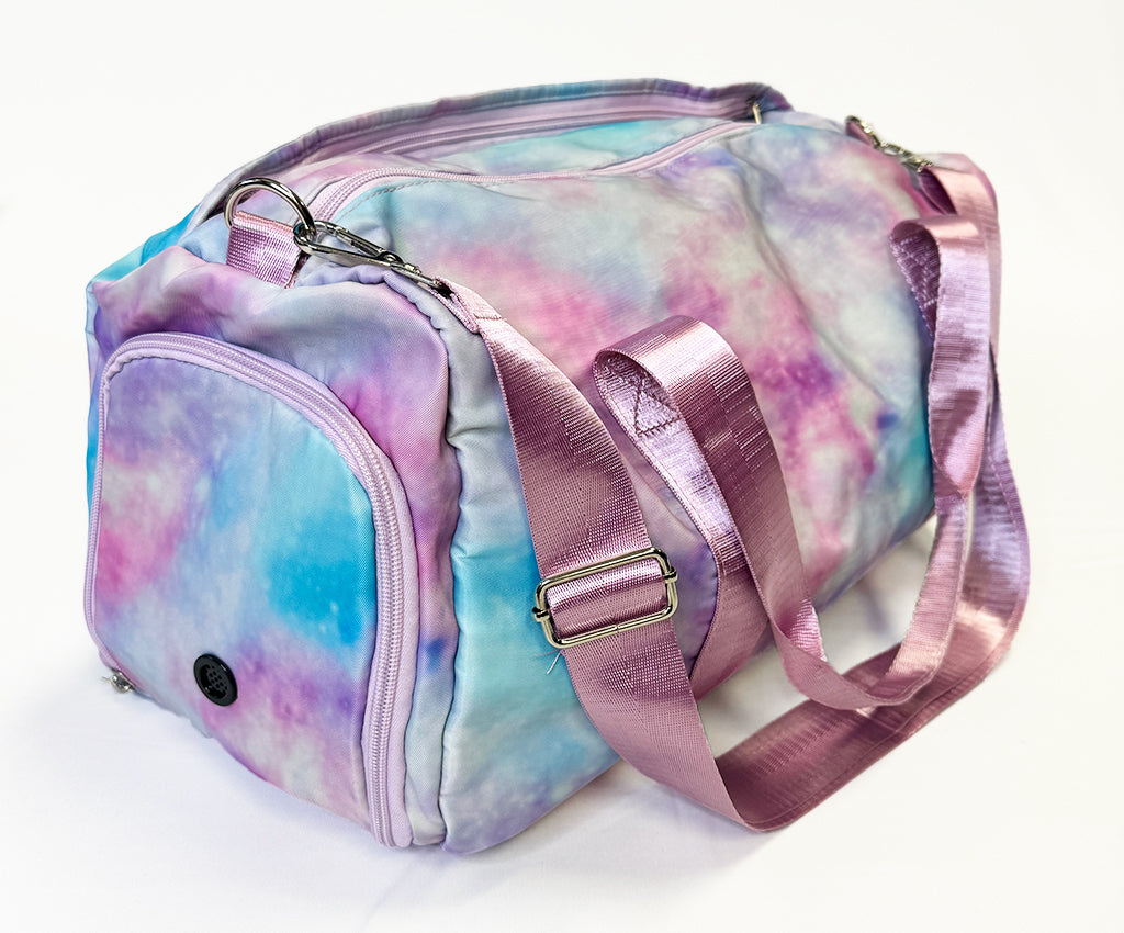 This Kissed By Glitter Purple Tie Dye Duffle Bag is perfect for dancers, gymnasts, cheer or anyone wanting a cute overnight duffle! The size is big enough to carry all your dance shoes and other dance essentials. Perfect for recreational and competitive dancers.