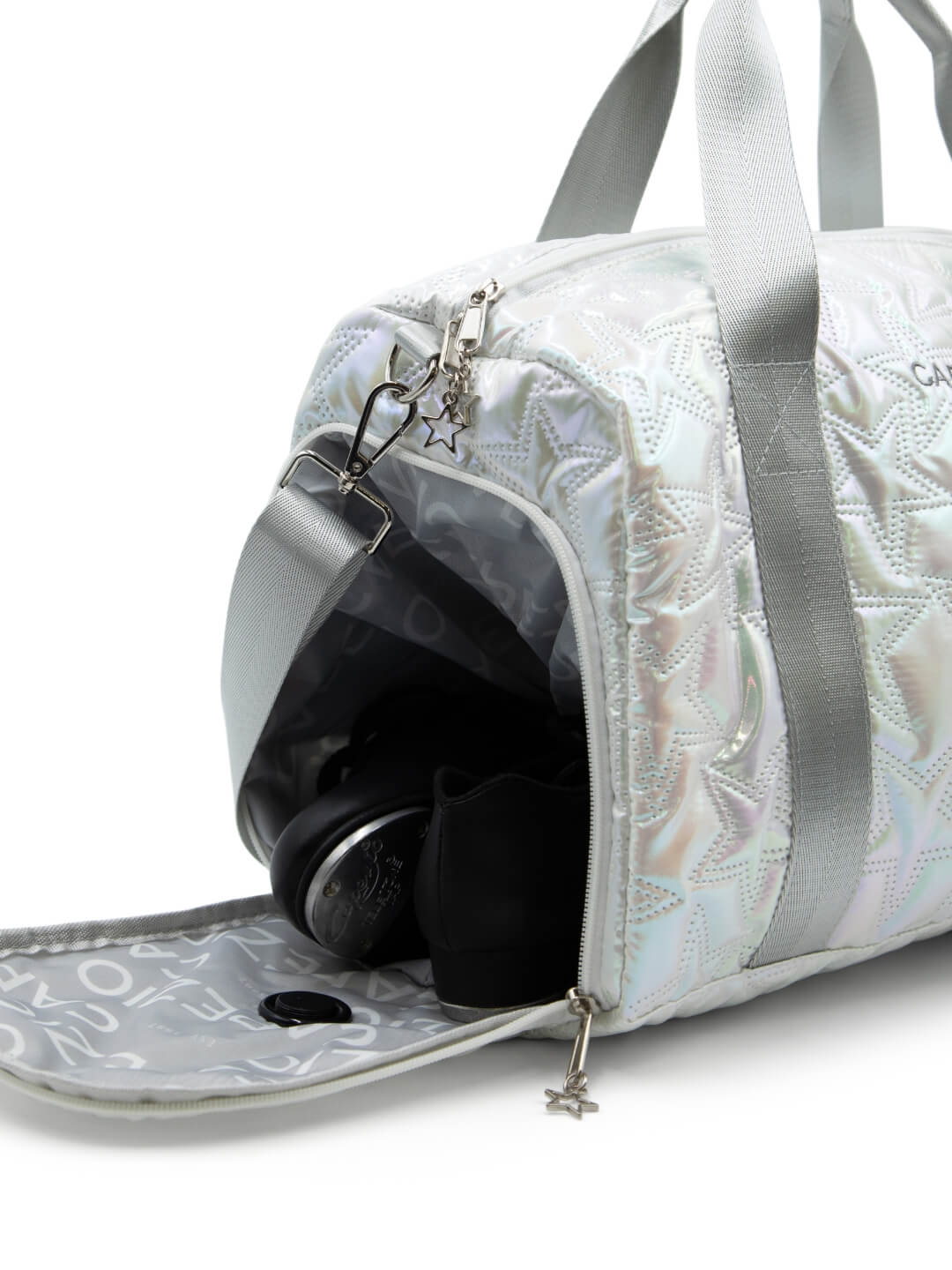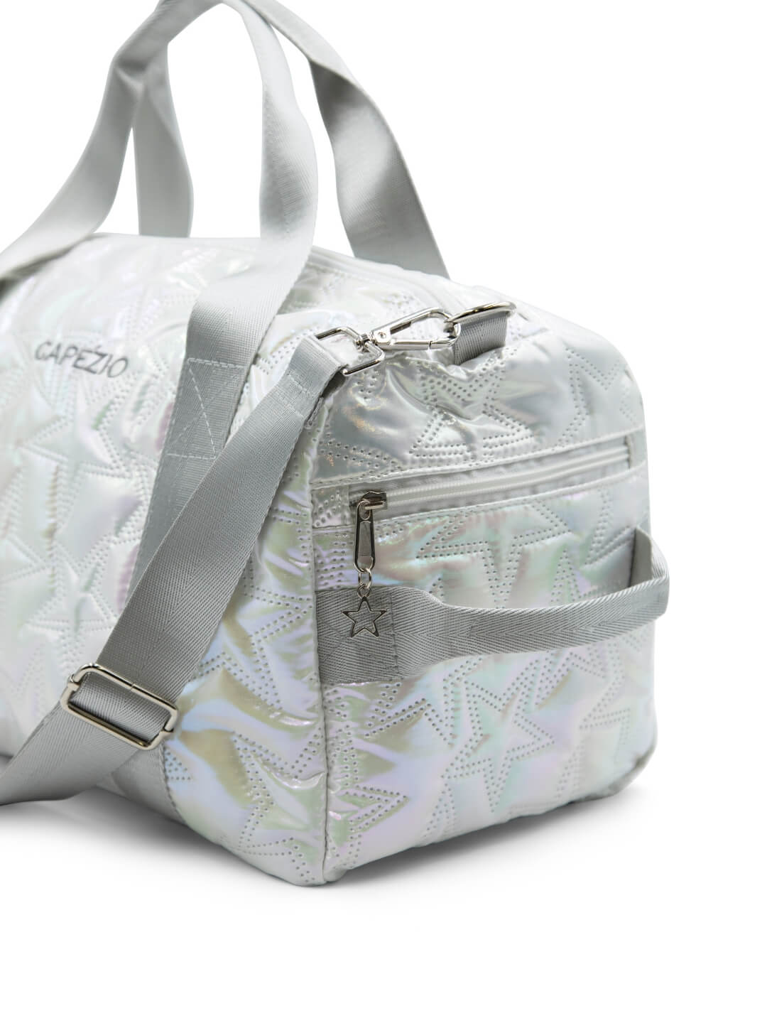 Feel like the star you are in the new Metallic Star Travel Duffle. This lightweight and waterproof bag is perfect for all your adventures. It includes tote shoulder straps for easy carrying, along with an adjustable and detachable shoulder strap. The zipper closure keeps your items safe, while a ventilated shoe compartment helps separate footwear from your other items. The bag also features a luggage strap for convenient attachment to rolling bags and two open pockets inside for quick access to essentials. The duffle bag features a Capezio logo lining on the inside and embroidered branding on the outside.