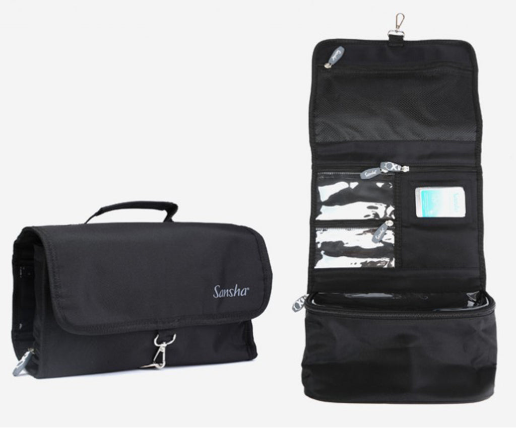 This Sansha cosmetic/makeup bag is fabulous for travelling to hold all your makeup as well as toiletries. There's a large mesh pocket, 2 smaller clear plastic front pockets, a larger hidden pocket behind a small mirror, and an expandable clear top pocket at the bottom for all those "big" items. It has a clip on the top to hang in your rack-n-roll or costume bag for dance or you can roll it up and clip it shut to fit in your suitcase.
