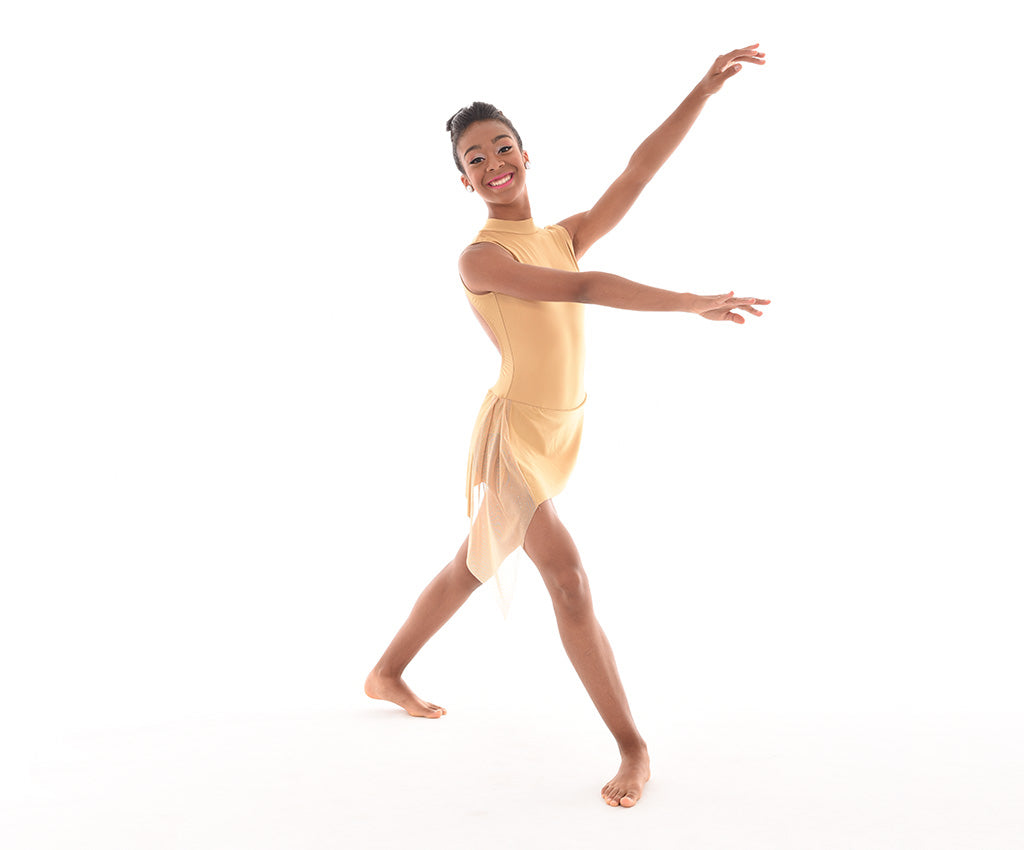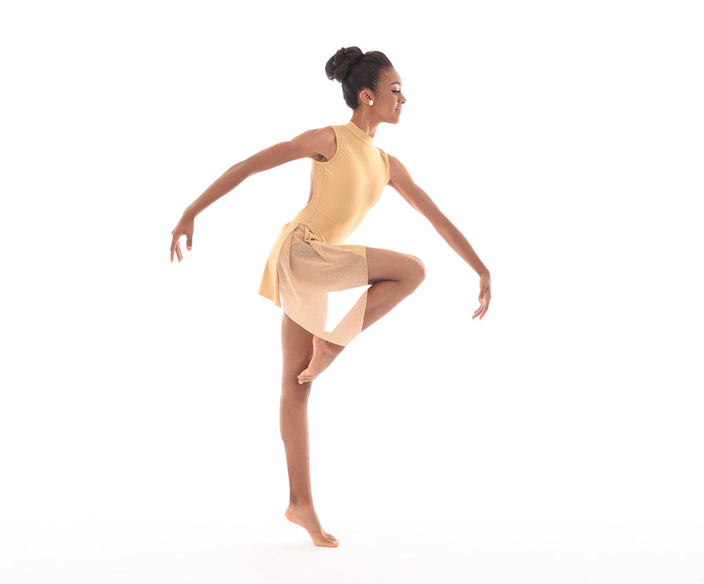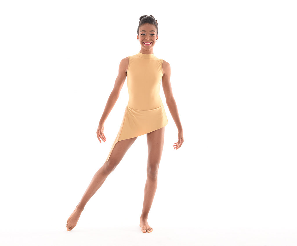 MOD's sleeveless open back leotard is made in quality stretchy lycra and has a fully lined front. Fabric collar with plastic clasp around neck for comfort and security. Attached A-line Asymmetric skirt with a trendy matching coloured mesh insert on the long side finishes this classy look. Makes a beautifully simple costume for any Contemporary or Lyrical routine. Or use as a base for Design it Yourself appliques, flowers or rhinestones to make a unique one of a kind costume.