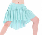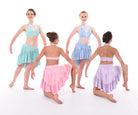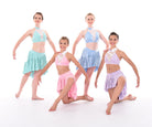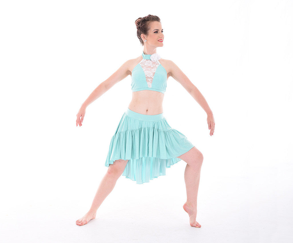 This classy high neck raglan top of shiny crystal knit features a white lace center panel & chiffon & rhinestone flower decoration. Full back with clasp at neck, and trimmed in fancy elastic with fully lined front for comfort & security. A wonderful Contemporary or Lyrical costume piece when paired with the Daydream Crystal Ruffle Hi Low Skirt that includes attached panty bottoms.