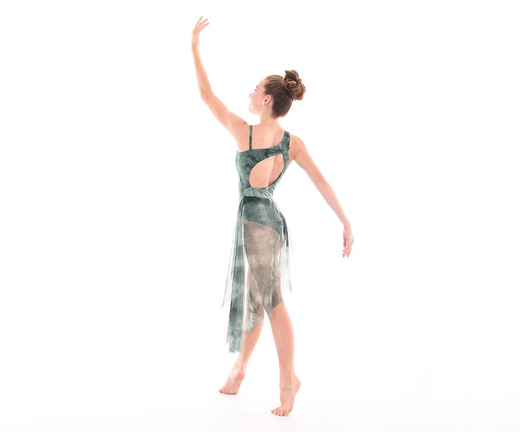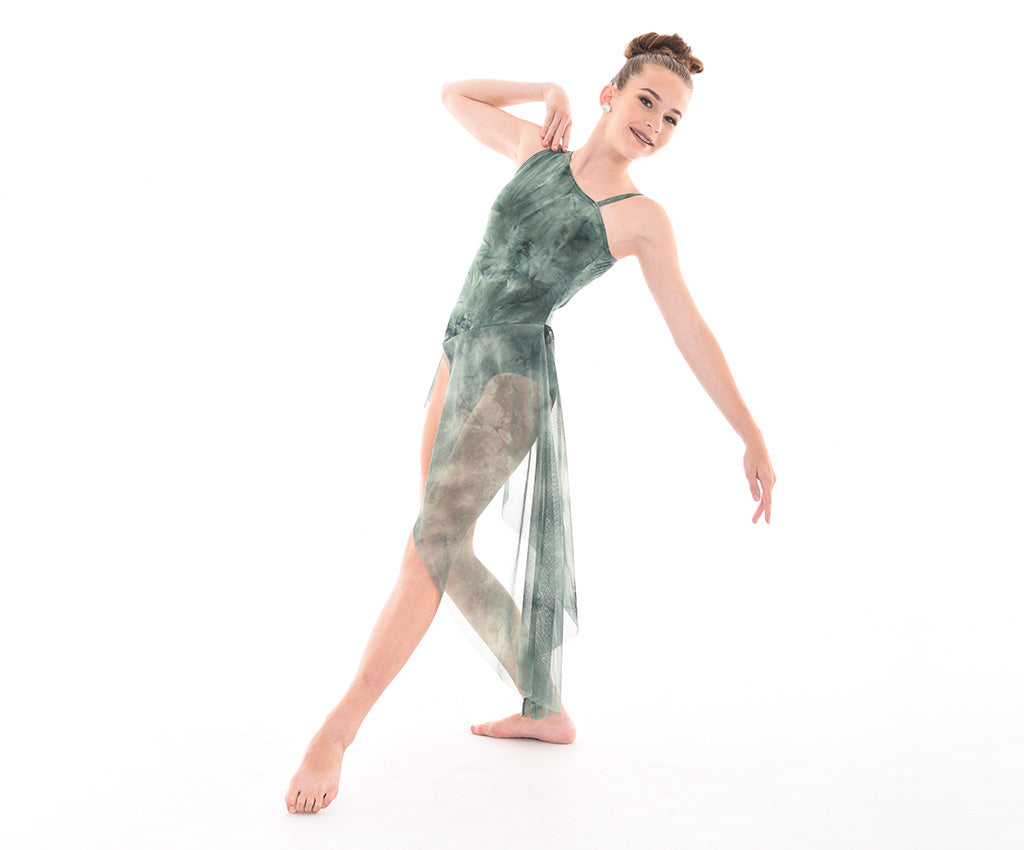 Gracefully stylish, this MOD exclusive design dress in quality, tie dye matte lycra and matching mesh will turn heads with its unique angled lines. The asymmetric bodice front and open back are flatteringly different. The attached skirt of matching tie dye mesh is attached on an eye-catching angle and graduates to a longer point at the ankle. This dress flows wonderfully for any lyrical or contemporary dance but is also perfect for a different ballet number. A beautifully elegant costume as is, or add some appliques, flowers or rhinestone pieces from our Design it Yourself collection to create a fabulous unique custom costume.