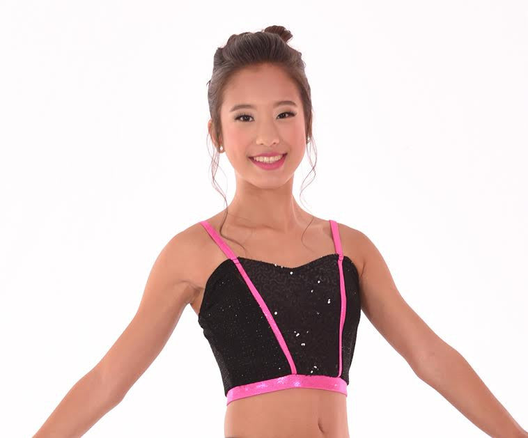 The sparkling waist-length top is accented by coloured mystique bottom band, piping, and straps. Lined, with soft elastic edge underneath for stylish comfort.