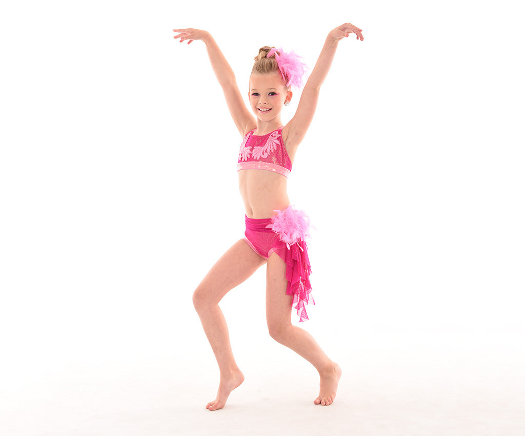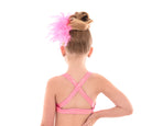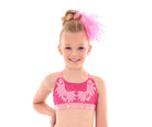 Shimmery and bright this crop top in luminous mystique is overlayed with a contrasting shimmery mesh for a sparkling finish. Lined front with scoop front it features fancy elastic edges for comfort and a soft mystique covered elastic bra band with wider cross-over straps and an open back.  Contrasting appliques on front add a pop of colour and fun. Matched with the Rainforest Feathery Sash Hot Short.