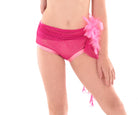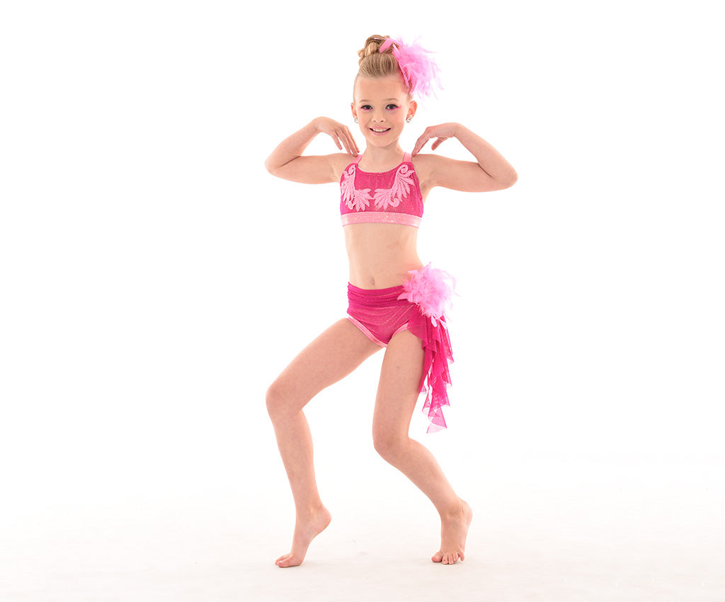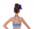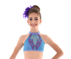 Shimmery and bright this halter top in luminous mystique is overlayed with a contrasting shimmery mesh for a sparkling finish. Raglan cut halter with back band sports a luminous mystique wrapped elastic bra band and soft collar with clasp. Lined bodice with sparkly mesh center front insert this top is edged in fancy elastic and includes angled back straps for extra comfort & seccurity. Contrasting appliques on front add a pop of colour and fun. Matched with Rainforest Feathery Sash Hot shorts.
