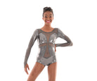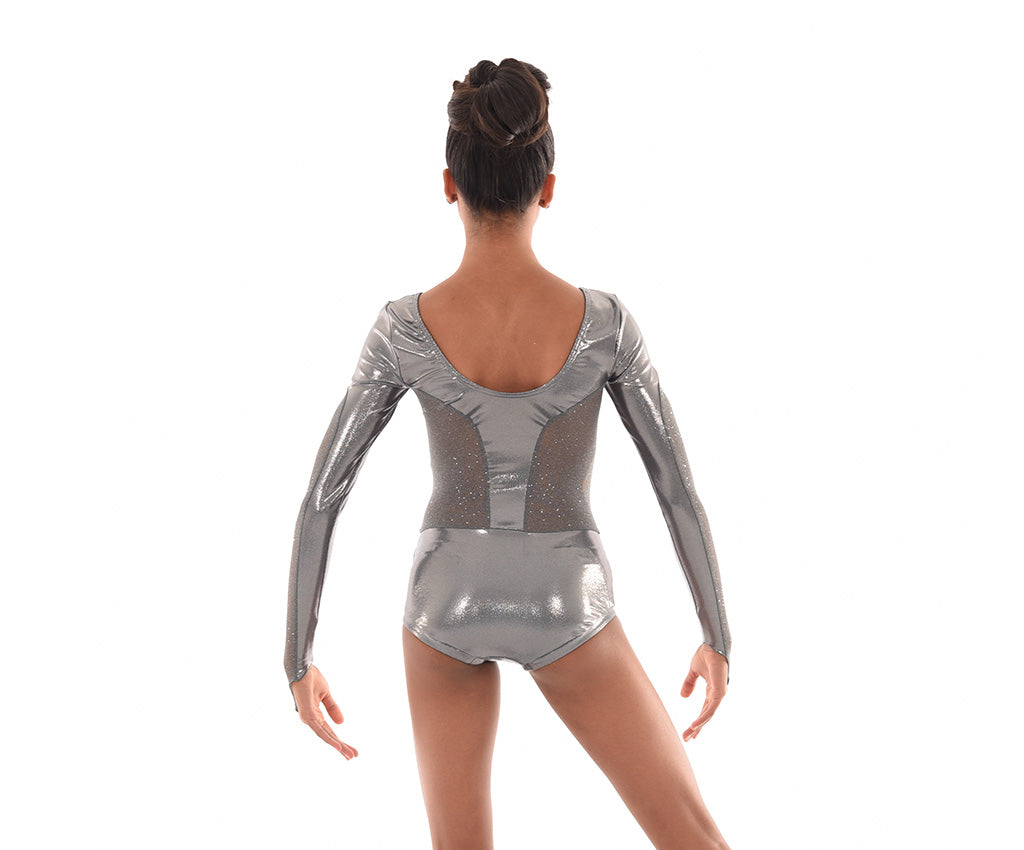 Modern and stylishly edgy, this long sleeve hotsuit in shimmery mystique features a cross pattern front and back. The flattering contrasting sparkle mesh inserts add a dynamic flare. The scoop neckline and a fitted long sleeve with shimmer mesh inserts and finger loops finish the look.  Lined front bust and short this suit has that perfect cut with legbands that don't ride up with any move.  Makes a great jazz or contemporary costume as is or add some rhinestones or finishing details from our Design it Yourself options for a uniquely custom look.