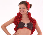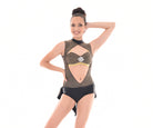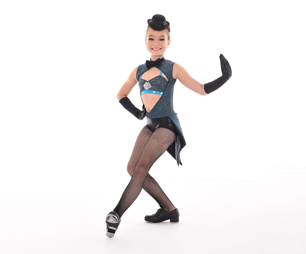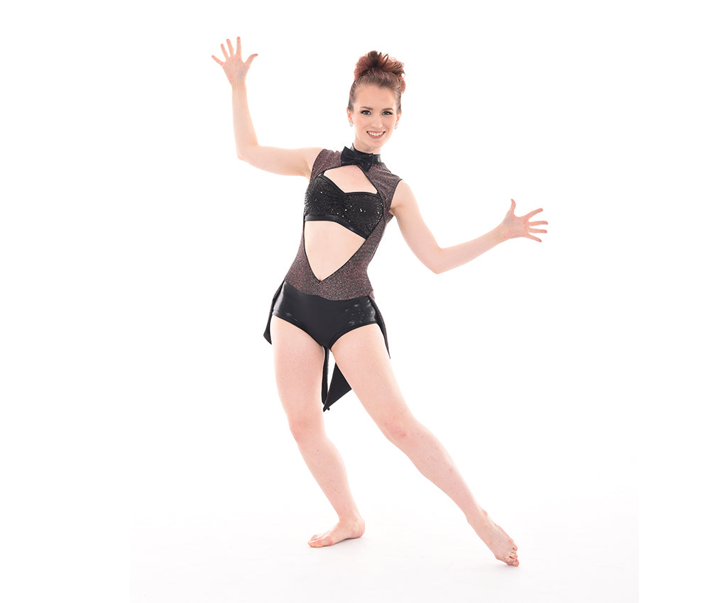 A MOD exclusive, this hotsuit of gitter slinky and mystique pops with the open front and large keyhole back. Edged in fancy elastic for comfort with a collar and secure clasp opening in back, the attached mystique hot short bottom has that perfect in between legline. The short bottom is lined and has wide elastic legbands for security and comfort. Attached glitter slinky & mystique attached tails add some definite pizzaz to this great costume piece. Comes with a matching Showtime Glam Halter top.