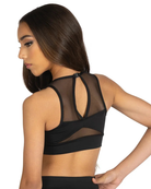 This cutaway crop top features a striking deep v-mesh insert in the front and stylized mesh block detailing in the back.