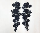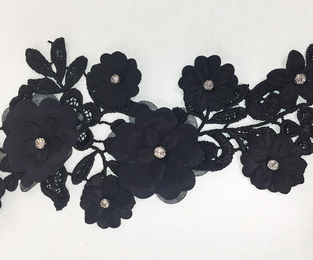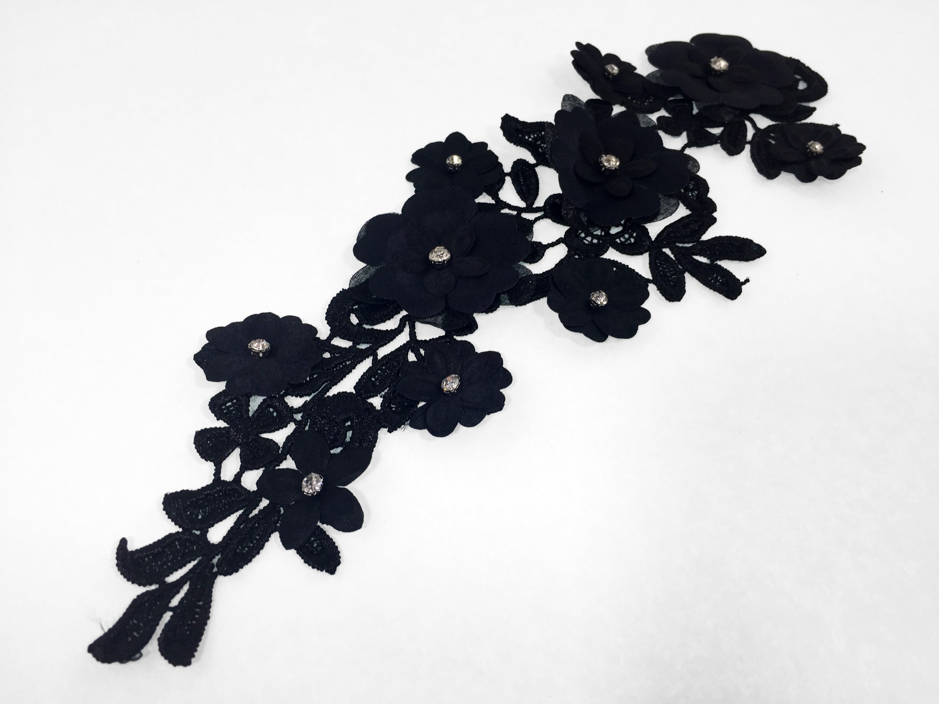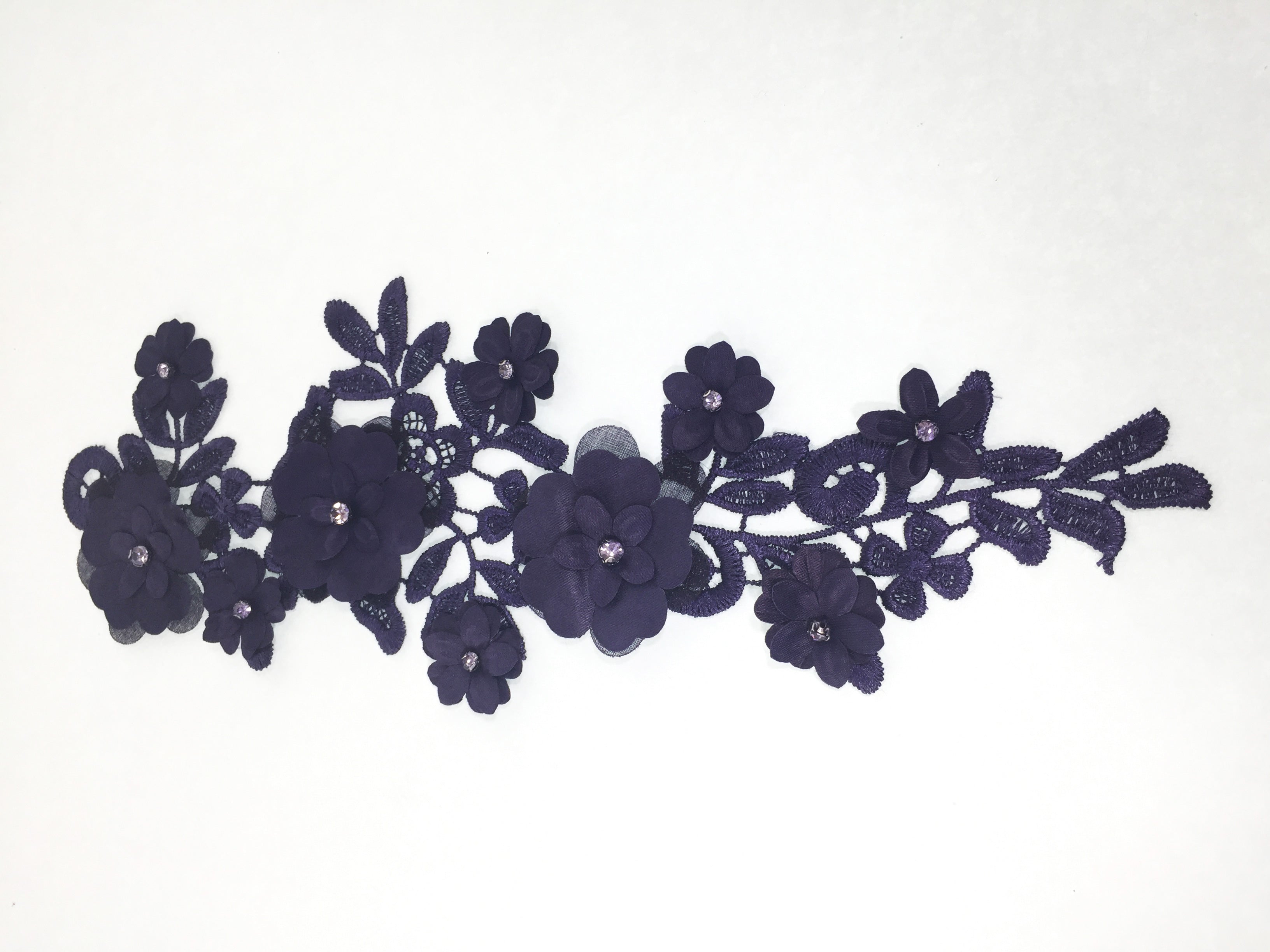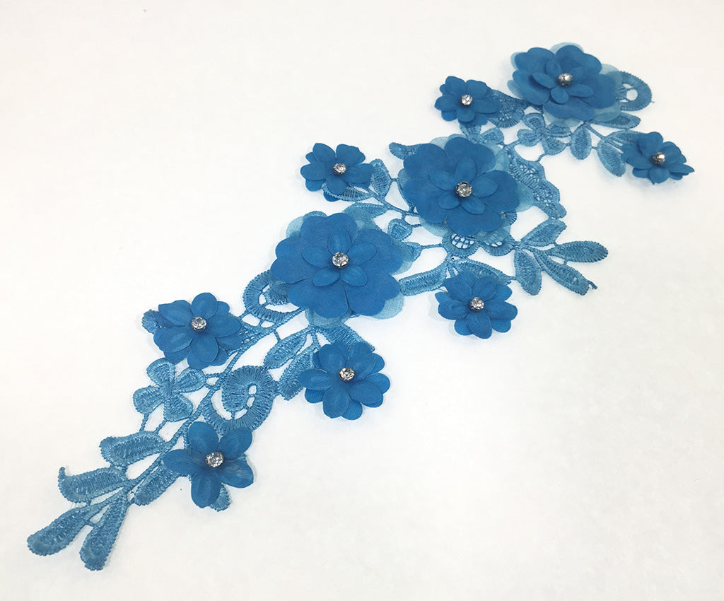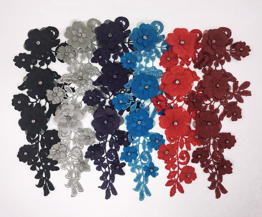 These classy 3D appliques have a satin open weave embroidered base. Raised large clover shaped flowers layered under smaller flowers with a sparkling center rhinestone are scattered throughout adding texture & sparkle. They are available in a variety of colours. Approximately 10 1/2 X 4 inches each. Sold as a mirrored pair. Professionally packaged for shipping.