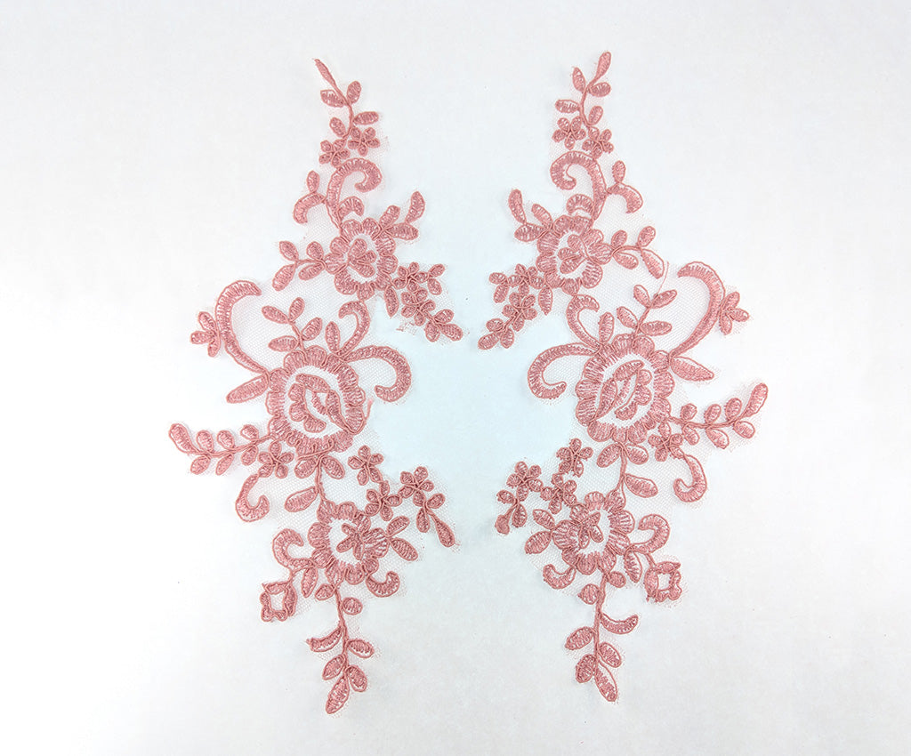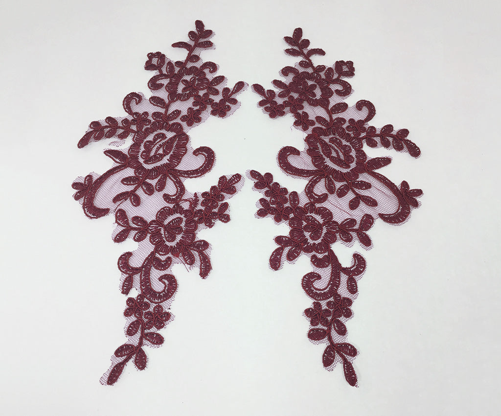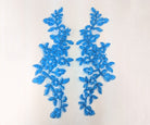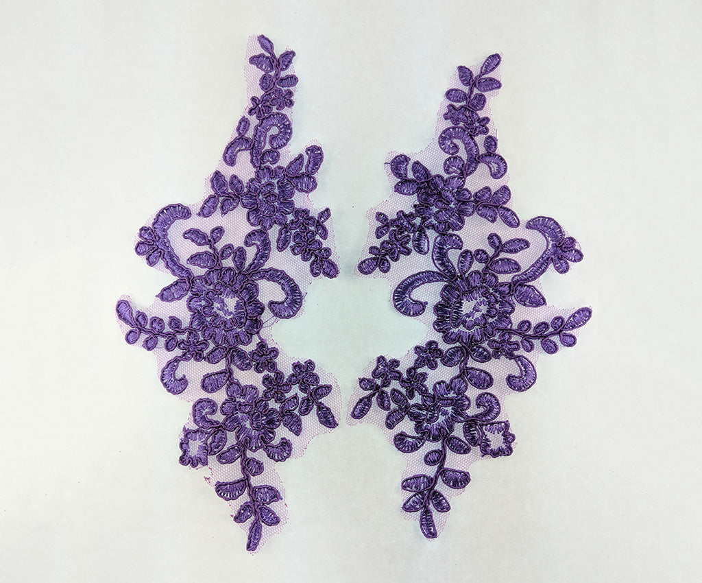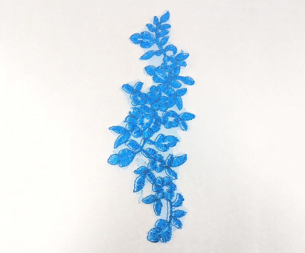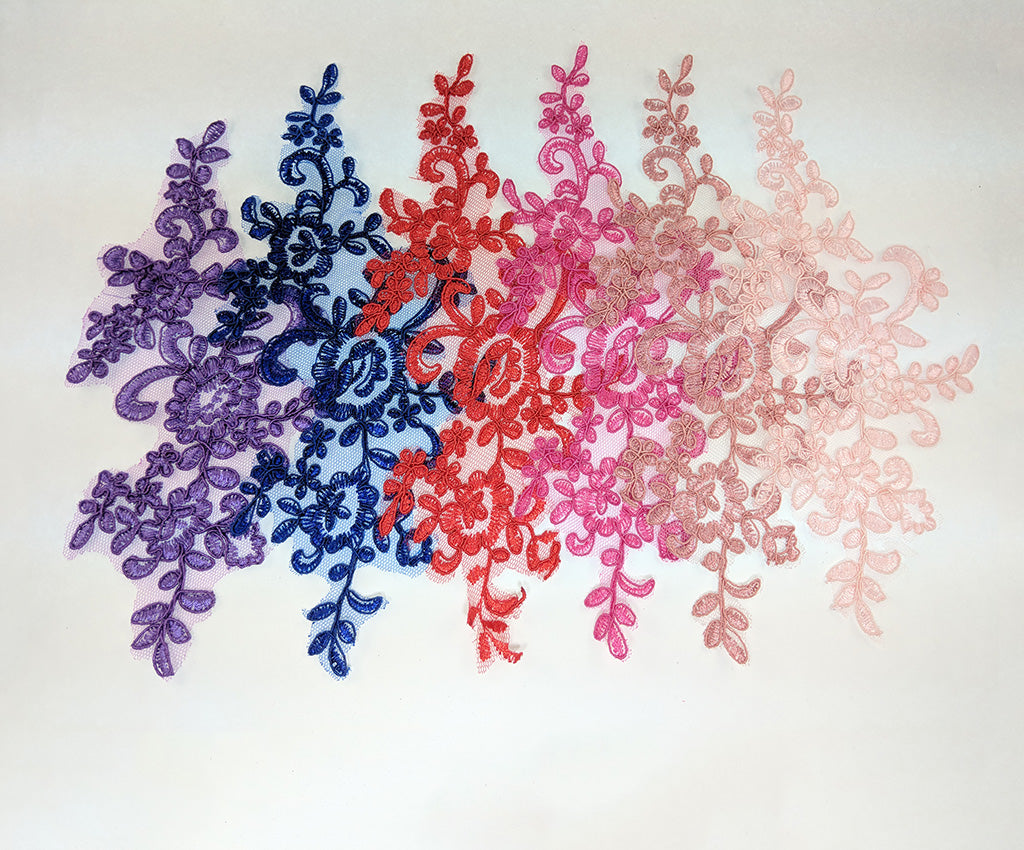 This satin finish floral applique is corded for a pop of colour and texture. Mesh backed these classy appliques come in a variety of jewel and pastel colours to match any outfit. Approximately 10 X 4 1/4 inches each. Sold in mirrored pairs. Packaged to protect product during shipping.