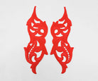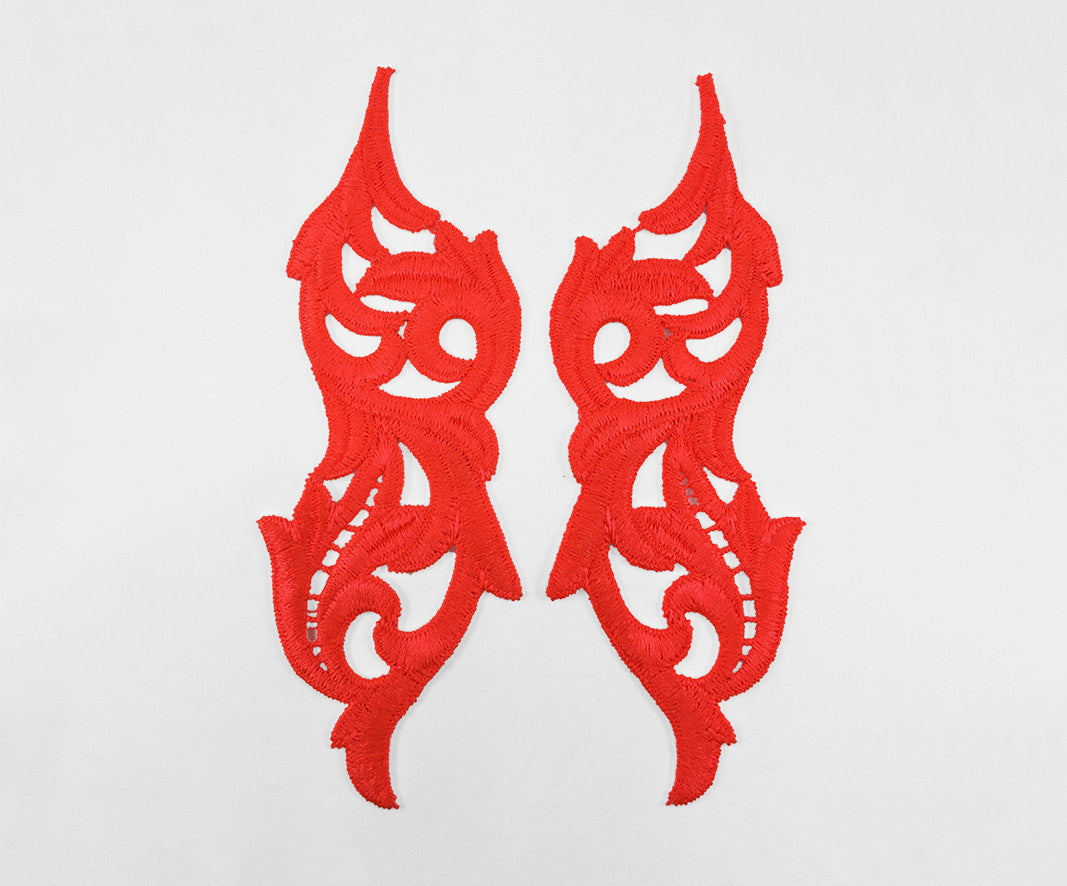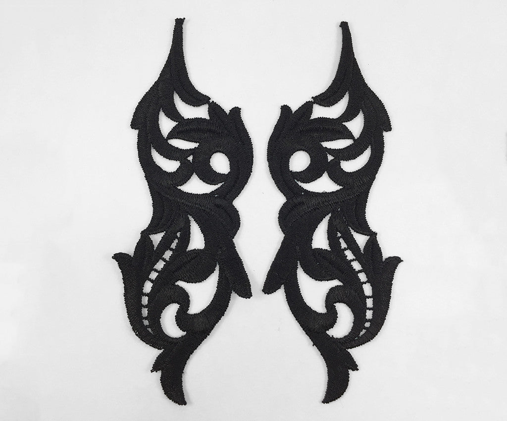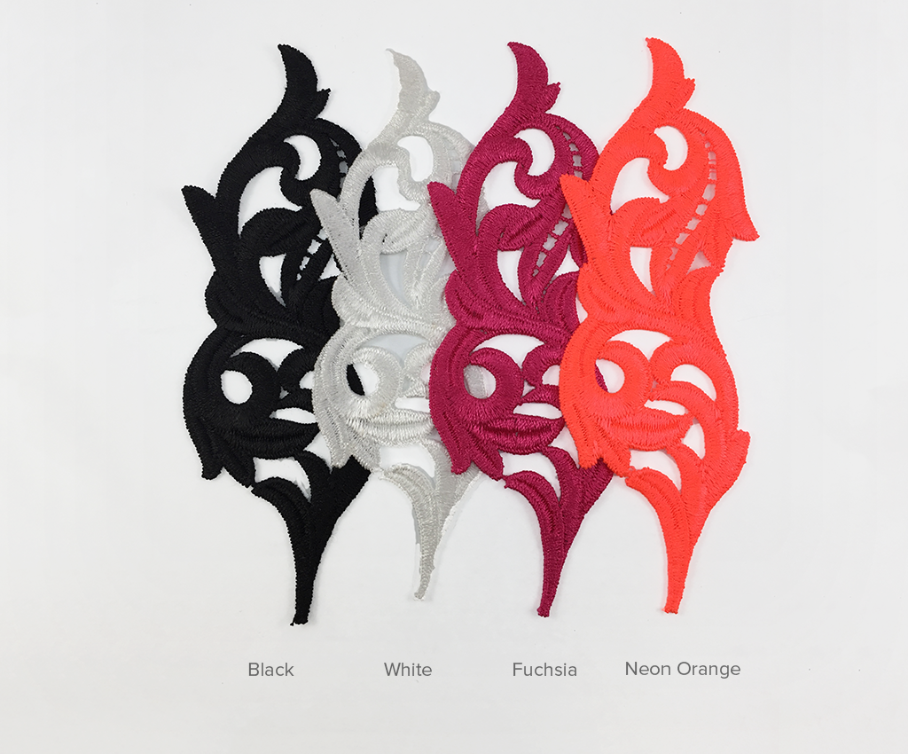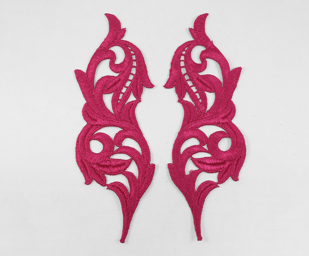 Satin finish cloth swirl leaf applique in a variety of colours. Approximately 6 X 2 1/4 inches each. Sold in mirrored pairs. Professionally packaged to protect product during shipping.