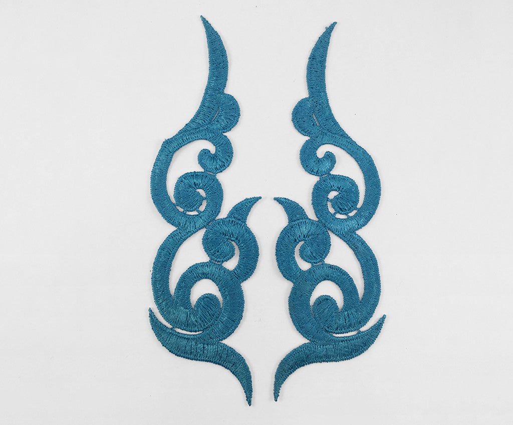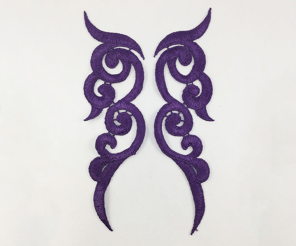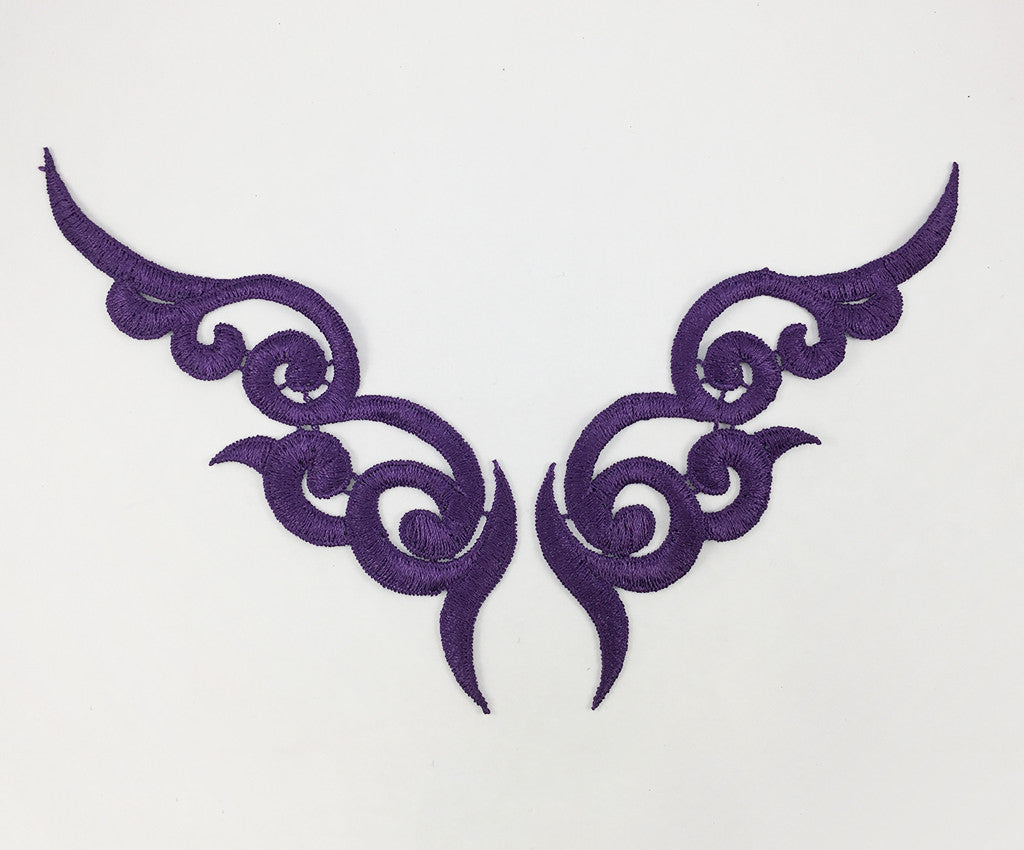 Satin finish cloth swirl lace applique in a variety of colours. Approximately 6 1/2 X 2 inches each. Sold in mirrored pairs. Professionally packaged to protect product during shipping.
