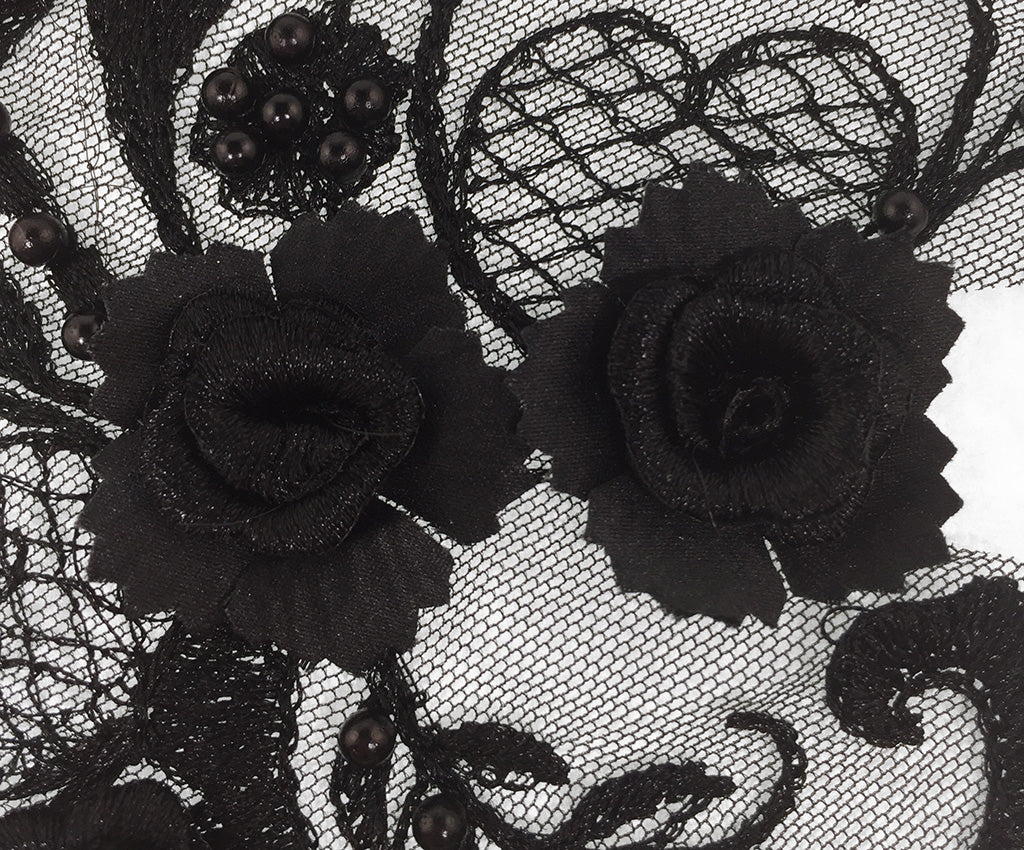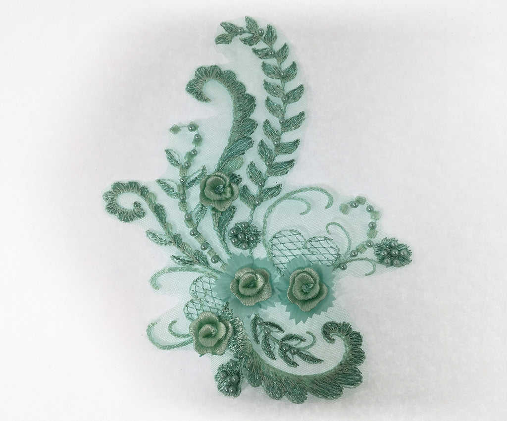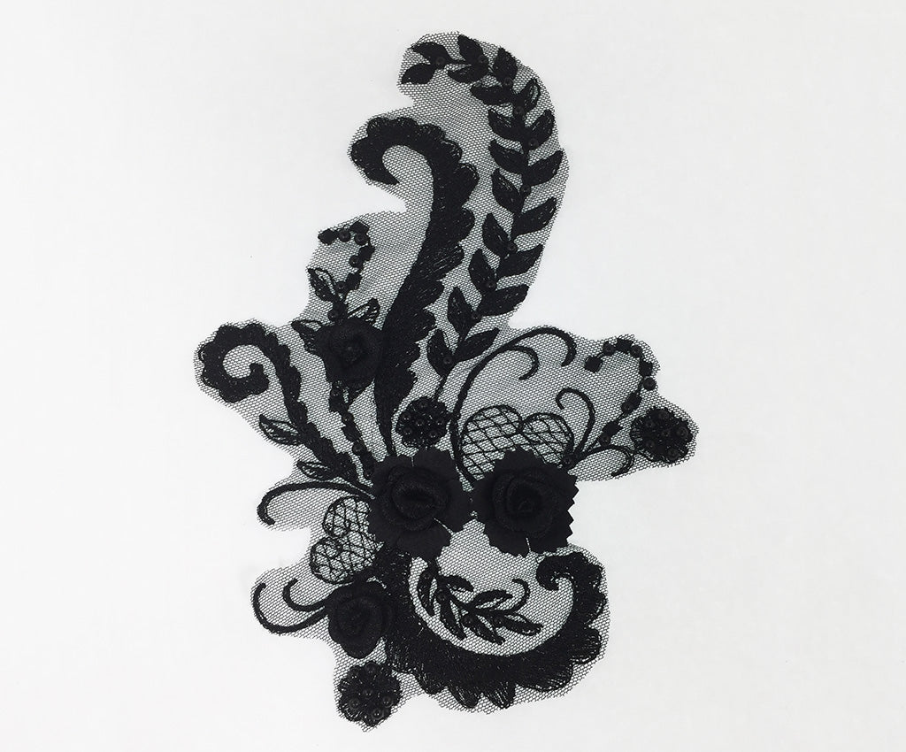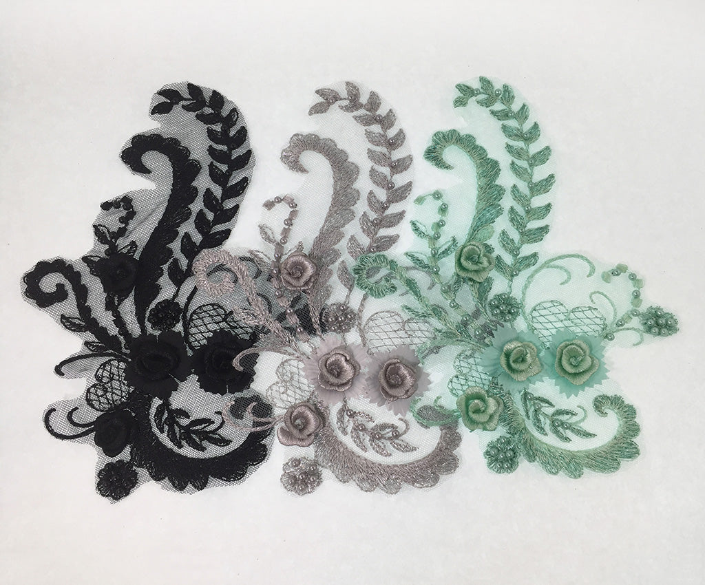 NEW! This mesh backed large lace applique has a 3 dimensional flower and embroidered satin finished leaves. Detailed with matching pearls this elegant applique adds a classy finish to any outfit. Available in 3 colours, it is sold as a left or right side. Buy one of each to get a mirrored pair or a single one if you want an asymmetric look. Approximately 9 X 7 inches each. Sold as a single piece as left or right. Professionally packaged to protect product during shipping.