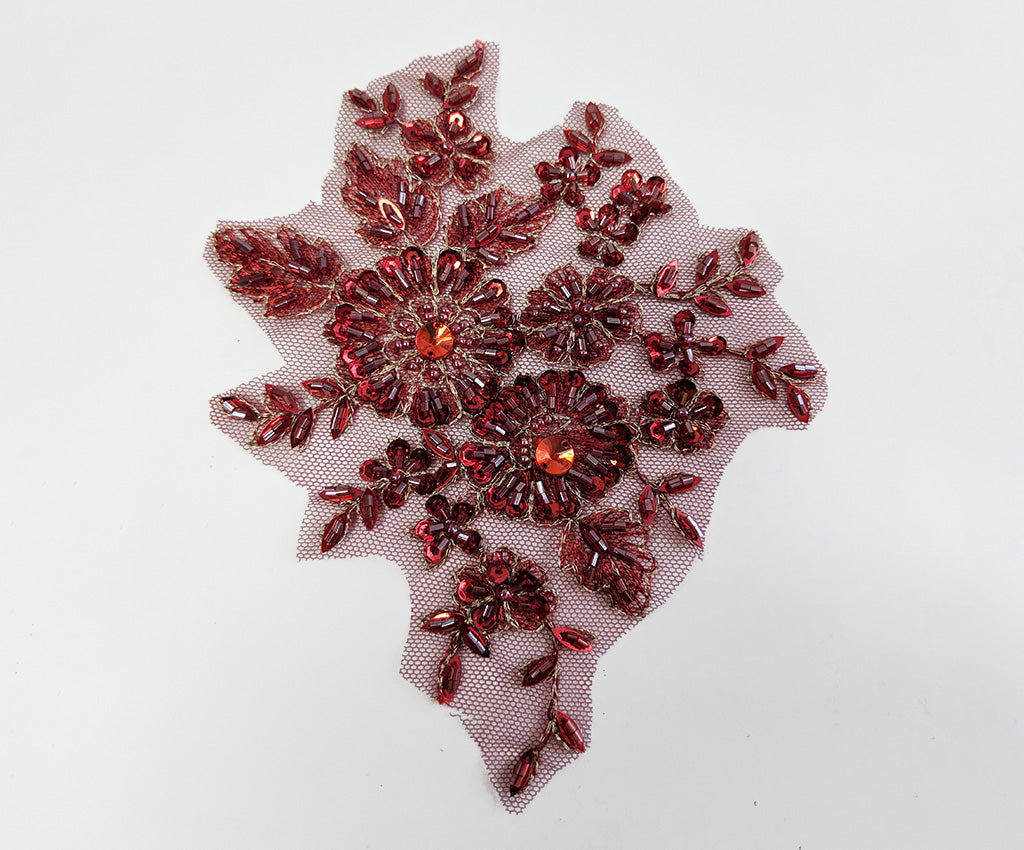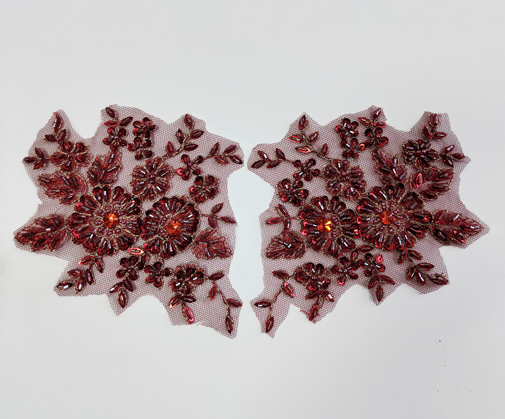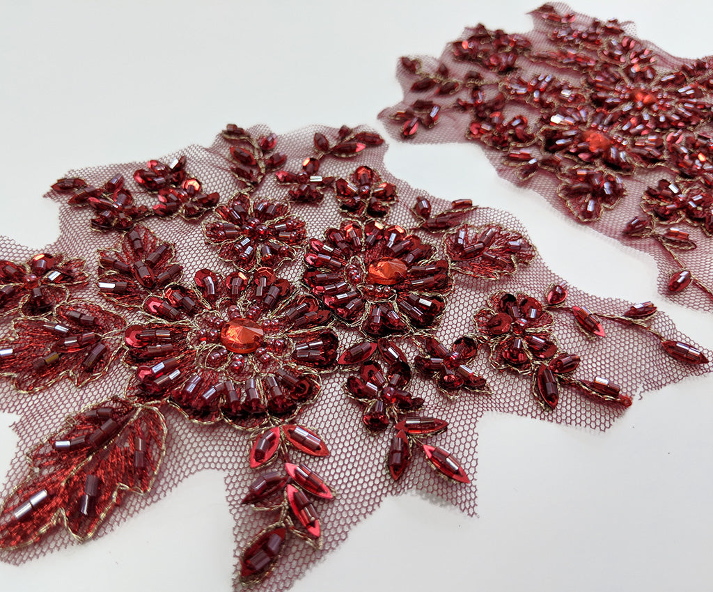 This mesh backed applique is beautifully beaded with red beads. This elegant applique adds a classy finish to any outfit and is perfect to decorate a dance costume. Approximately 6 X 4 1/2 inches each. Sold in mirrored pairs. Packaged to protect product during shipping.