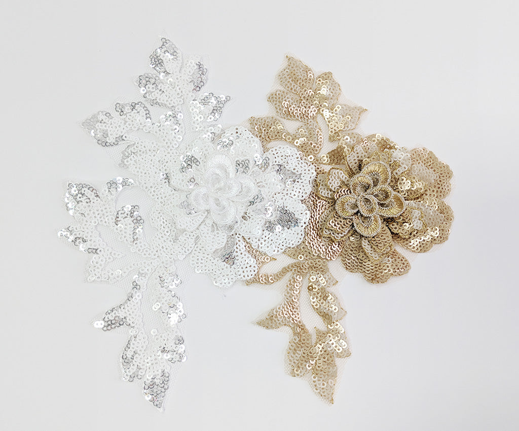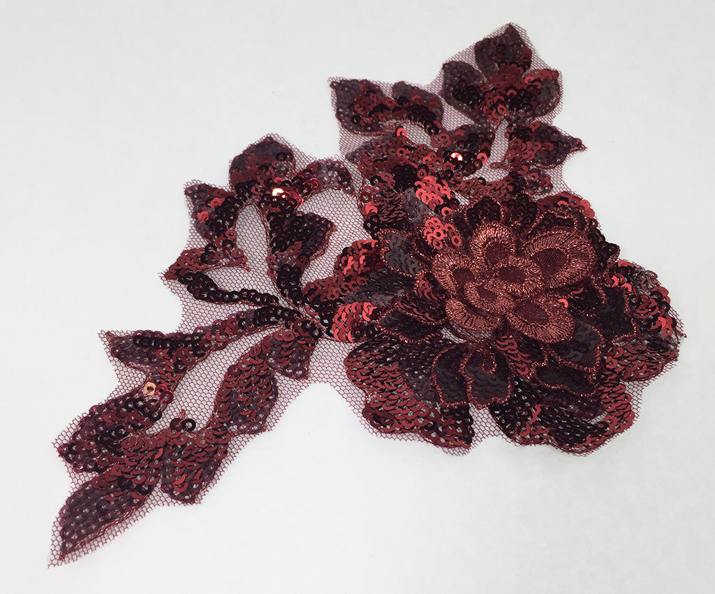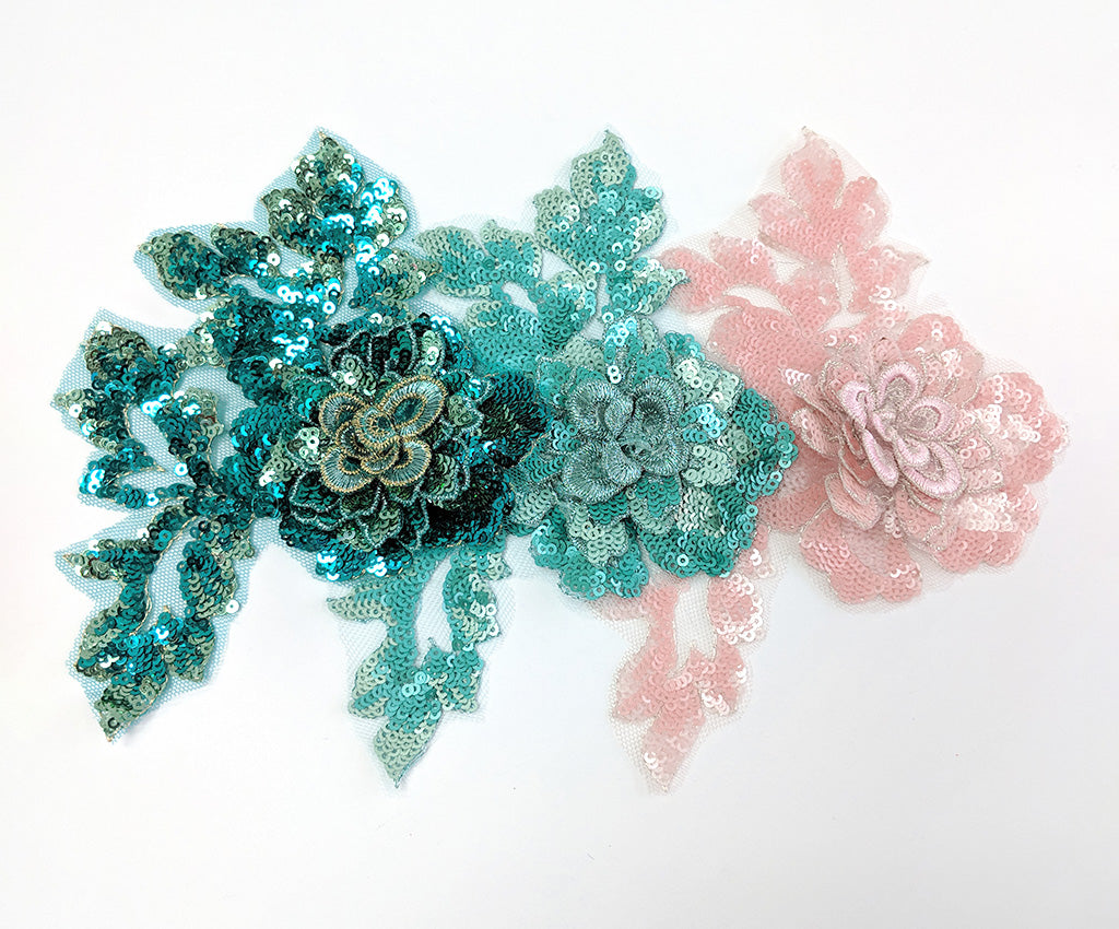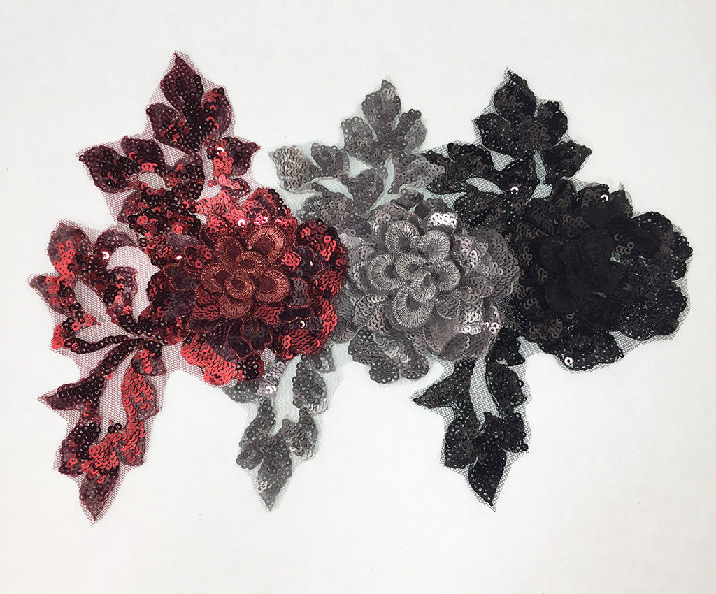 NEW! This mesh backed two toned sequin applique has a 3 dimensional central flower satin finished in a contrasting colour and surrounded by sequin leaf details. Comes in an assortment of colours and works well matched with the Small Sequin Floral Applique. Approximately 7 X 5 inches each. Sold as a single piece. Professionally packaged to protect product during shipping.