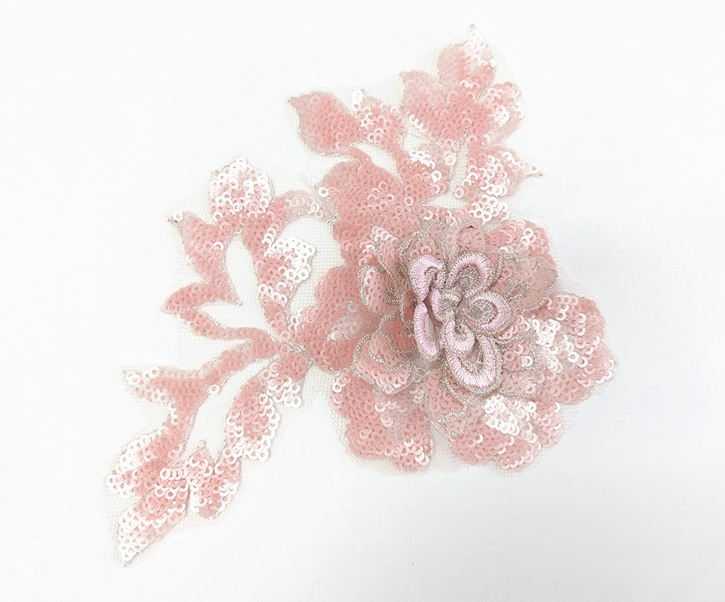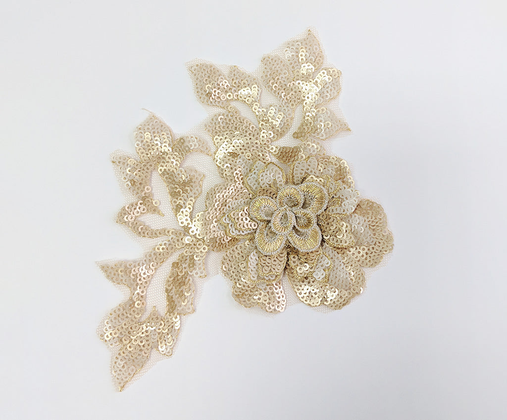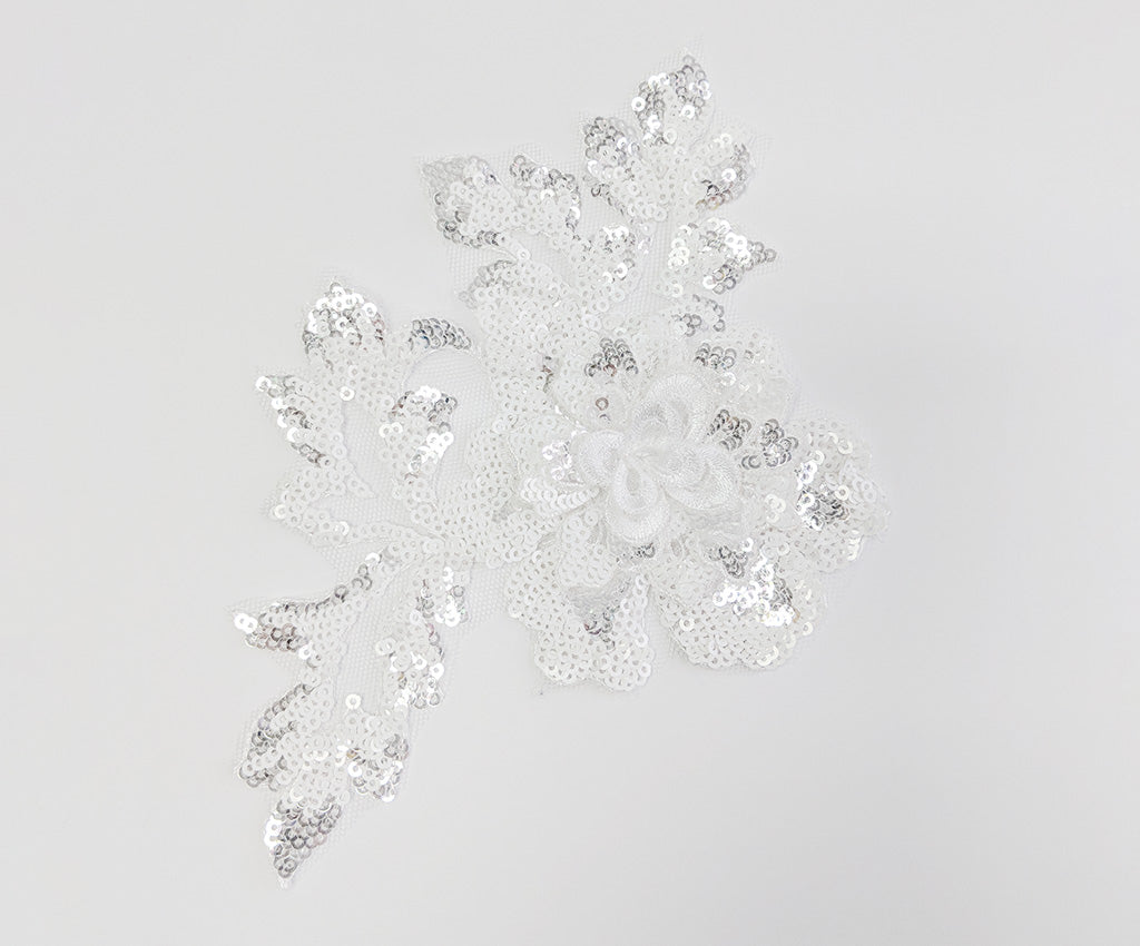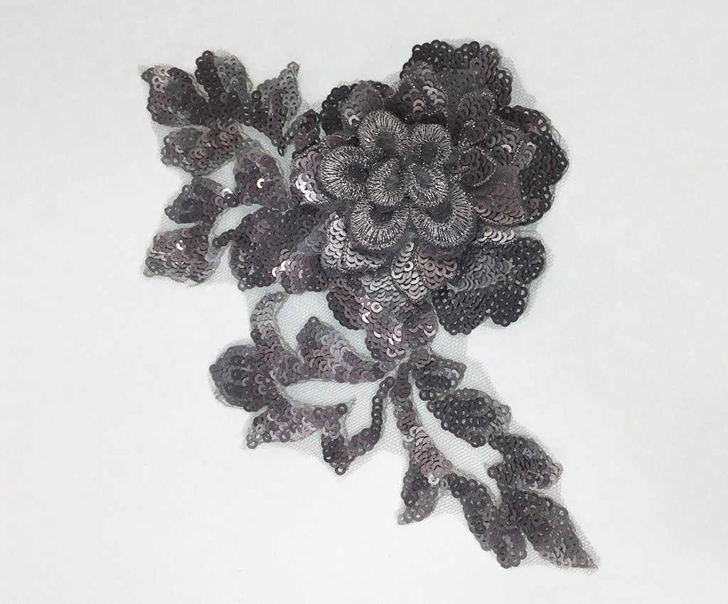 NEW! This mesh backed two toned sequin applique has a 3 dimensional central flower satin finished in a contrasting colour and surrounded by sequin leaf details. Comes in an assortment of colours and works well matched with the Small Sequin Floral Applique. Approximately 7 X 5 inches each. Sold as a single piece. Professionally packaged to protect product during shipping.