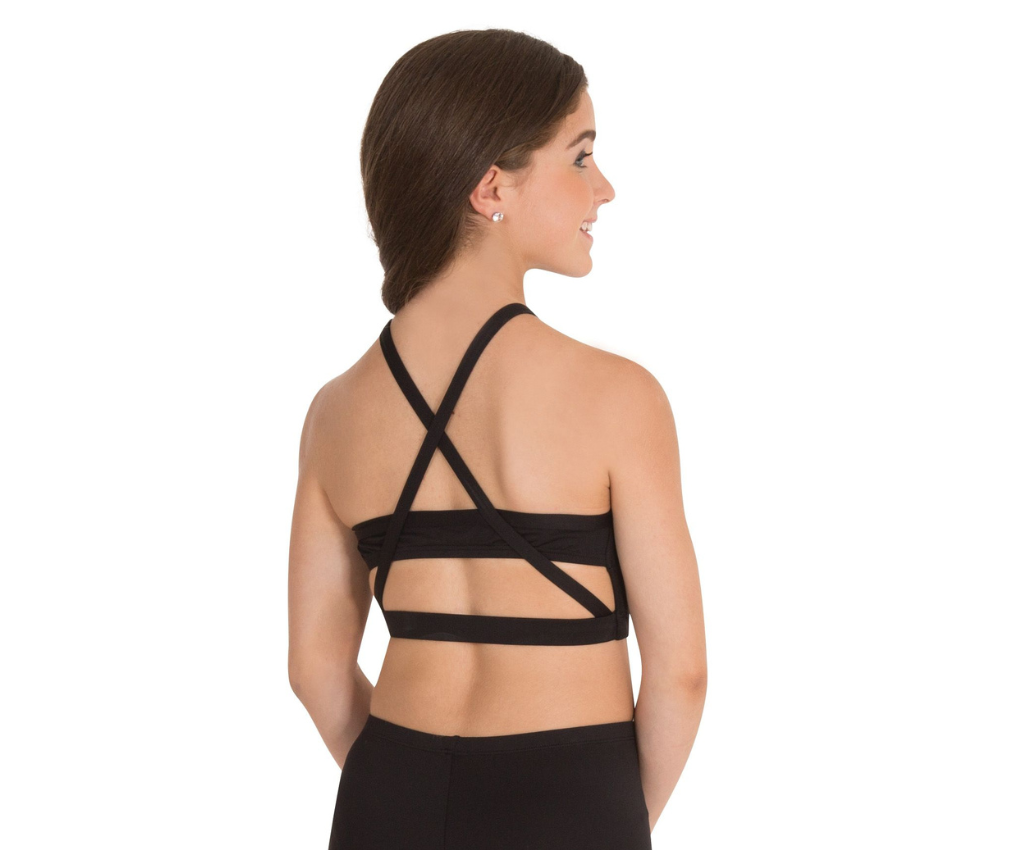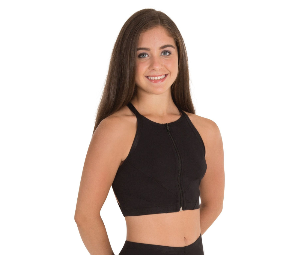 This Bodywrappers top has a high neckline with a full zip front and some seam details. The back features 3/4 wide crossed straps, a band across the back and longer line cut. This top is great for dancers looking for a simple but interesting top to wear to class or conventions.