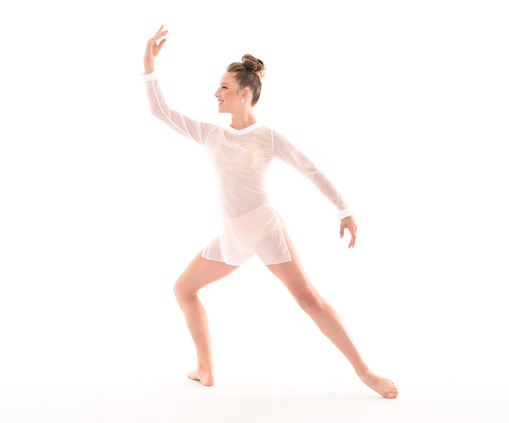 Our MOD long sleeve overtop is made in quality stretch mesh. The neck and cuff has a matching shiny or matte lycra fabric. The fit is slightly looser overall with a side slit for easy movement. Wear over any matching or contrasting top, bottom or leotard for a simple contemporary costume, or add some appliques from our DIY collection for a more customized costume. Also great as a swimsuit cover-up