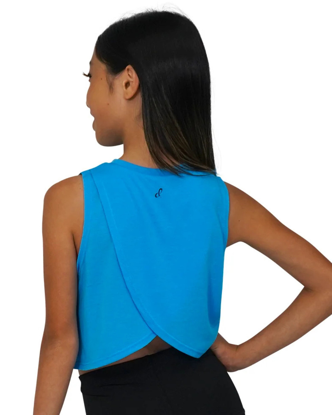 This Danznmotion tank is a plush feel viscose crop length cotton blend tank. Features a screen print with white heart design and the word "Dance". Cute overlap back design. Great top over a fitted dance top.