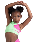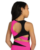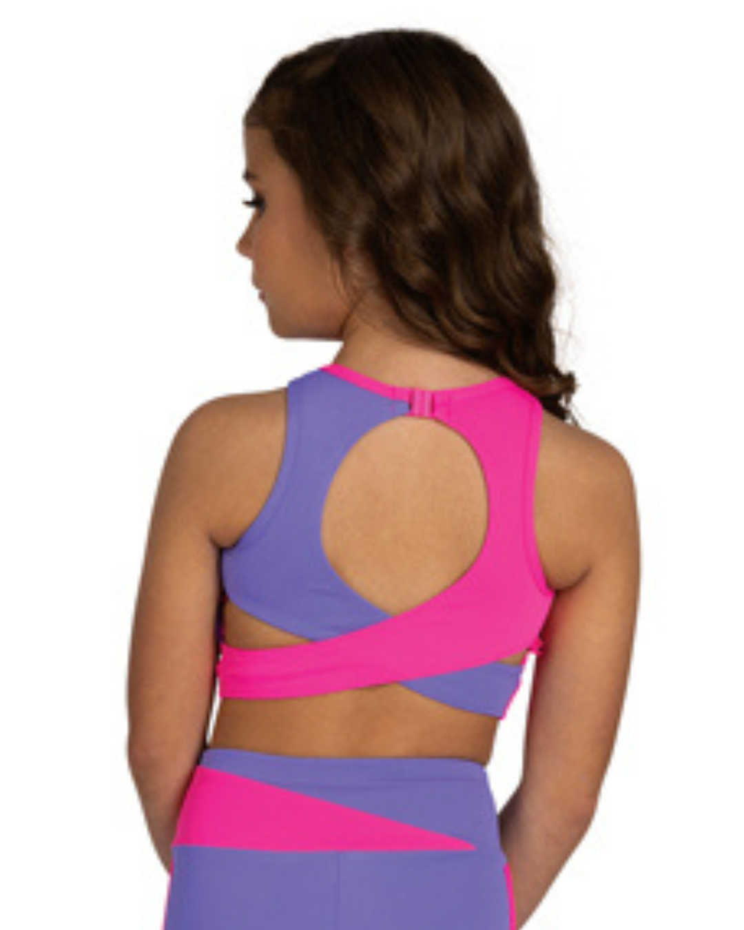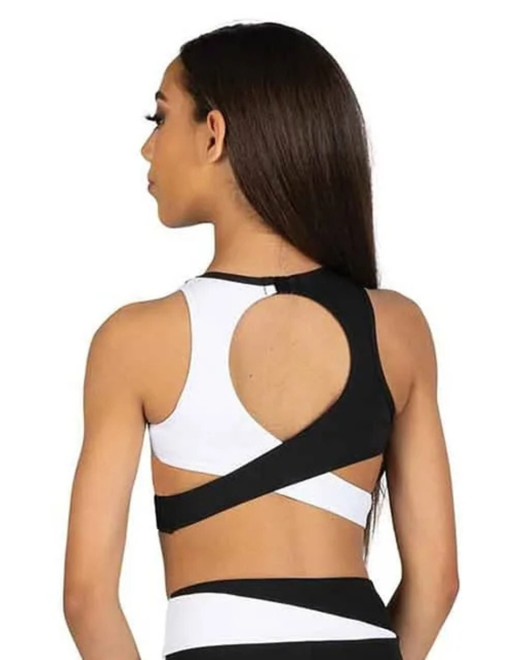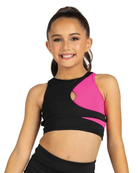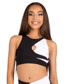This Danznmotion two-tone crop top has mirror detailing at the front and back and features a small keyhole at chest. Perfect for dancers during class, convention or photoshoots. Fully lined front.