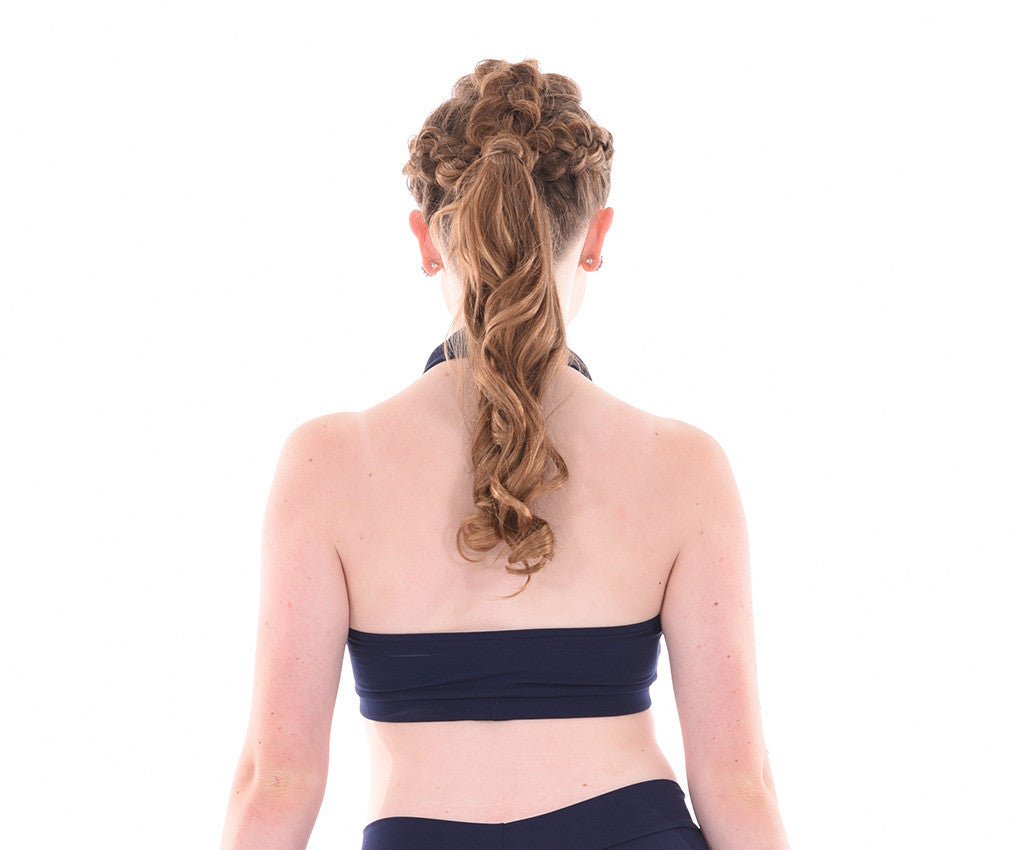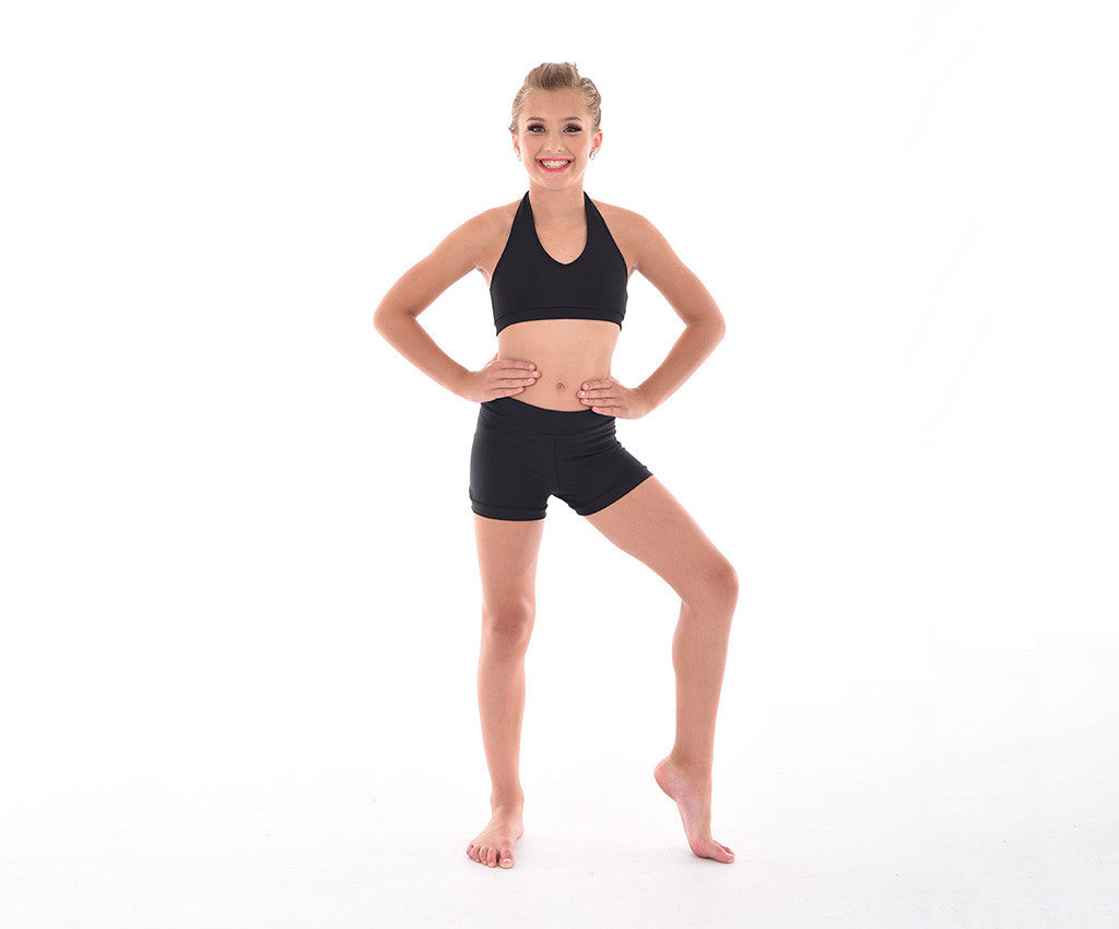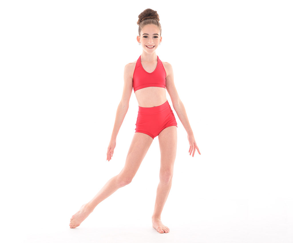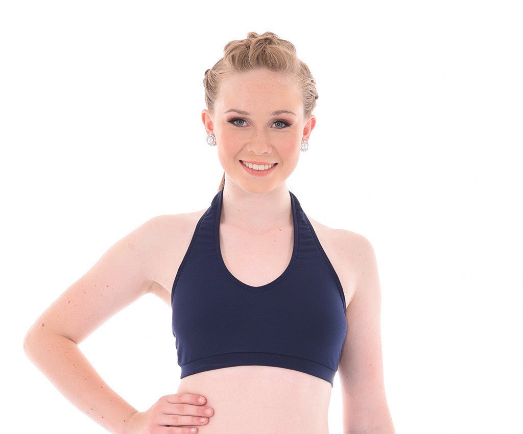MOD's basic halter crop top is made in comfortable quality supplex. Perfect for class or dance convention wear. Fully lined front, fabric wrapped elastic band under bustline & finished with a butterfly clasp at neckline. Match with any supplex Dancewear bottom or add some of our Design it Yourself finishing touches for a unique & simple costume.