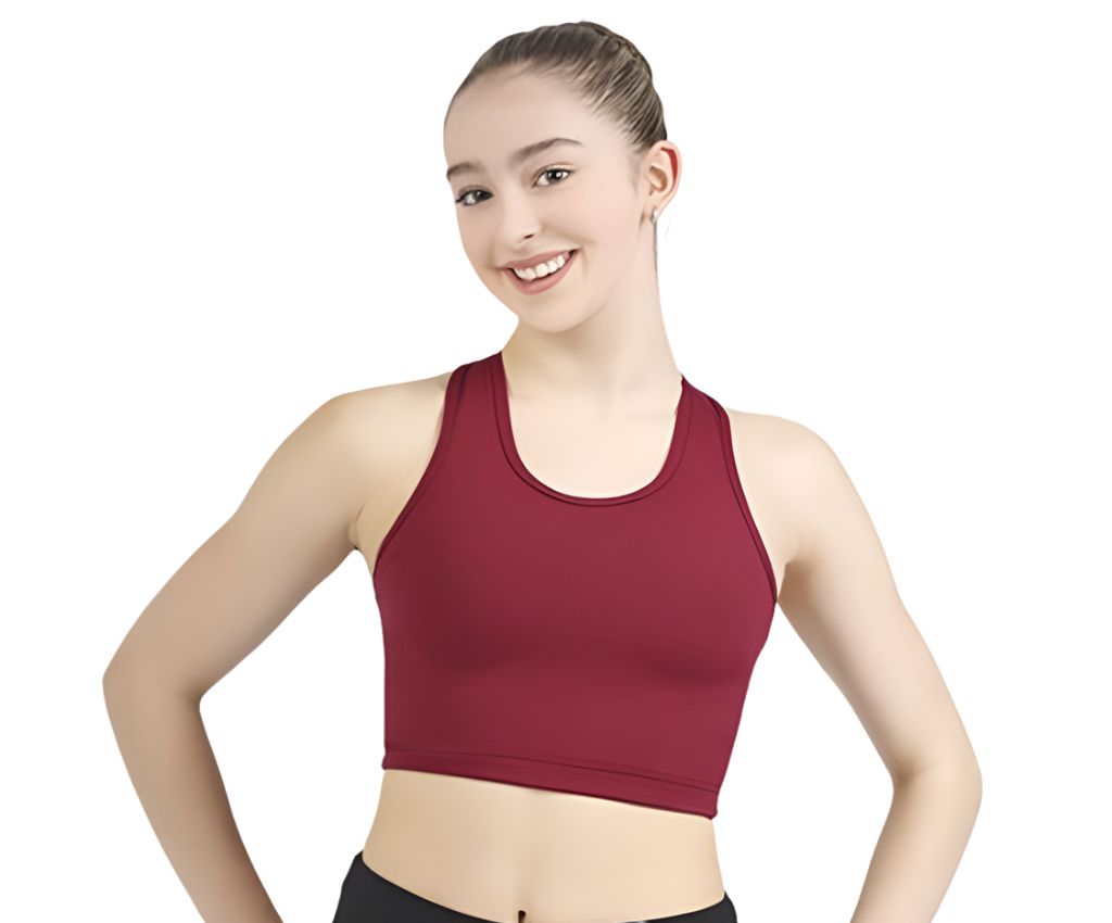 This longer line crop top is a perfect addition to your activewear or dancewear collection. Simple racer back style with an integrated bra and removeable cups for great coverage.