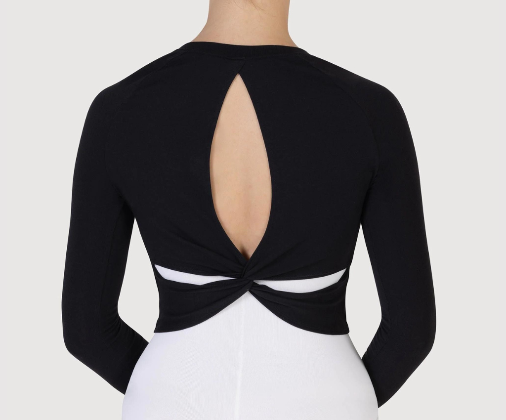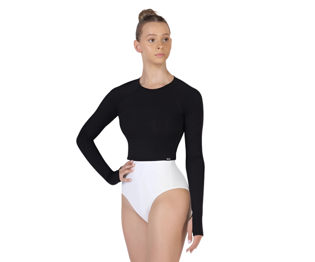 Bloch's Ladies Saoirse Soft Twist Back Top features long sleeves in a cropped length with an open twist back detail and thumbholes. Perfect for layering in the studio in this indulgently soft fabric.