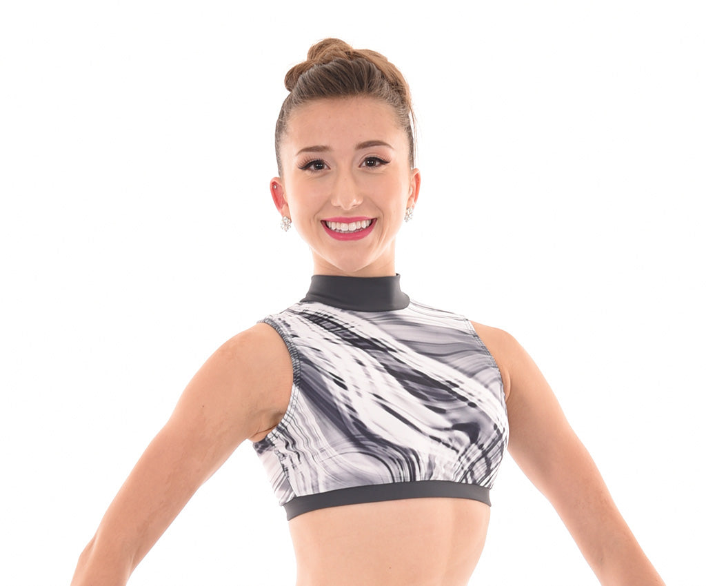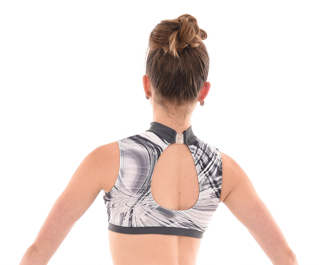 MOD's sleeveless print crop top is made in fun printed lycra fabircs. It features a full front with coordinating soft fabric collar and a wrapped 1" elastic band. Large keyhole back and butterfly clasp at neck. Fully lined front and turned elastic armholes. Match with any print or solid bottom. Also a great base for our Design it Yourself finishes.