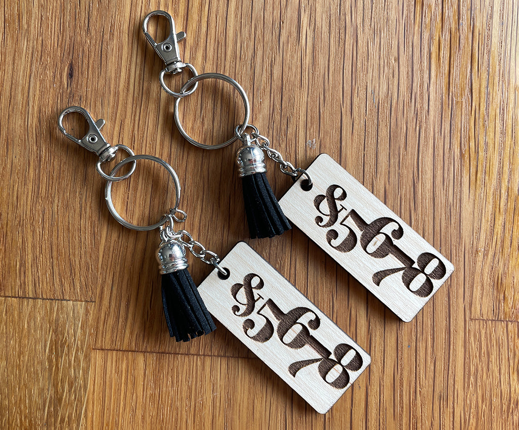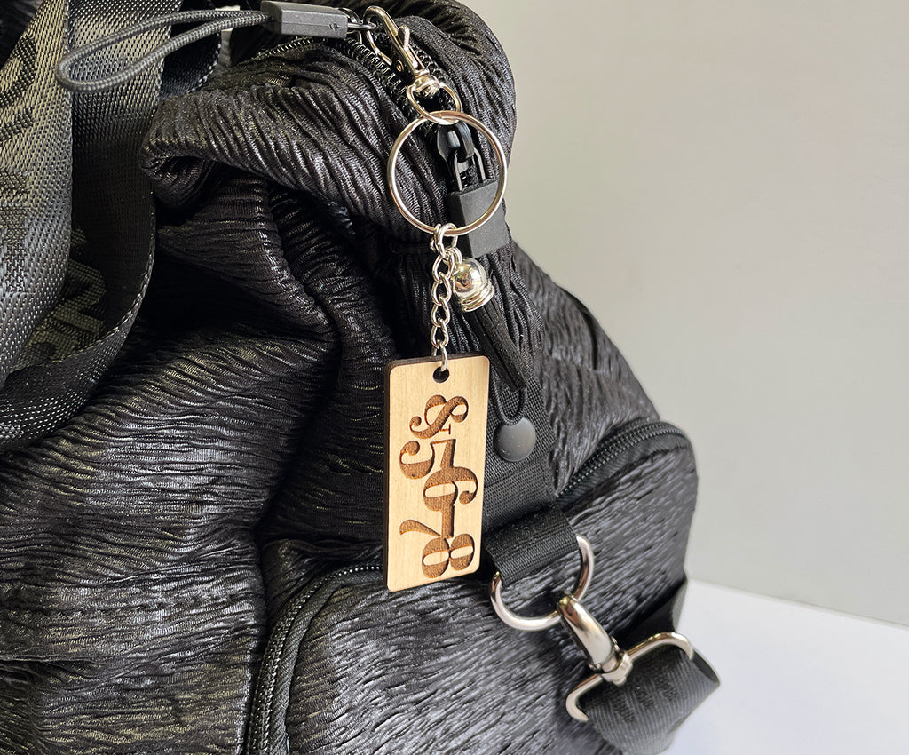 Show off your love for dance with these Rhythm Jewellery keychains. Handcrafted from solid Canadian Maple wood and engraved with '&5678'. Attached to a key ring with a silver chain and finished with a carabiner lobster clasp and a fun suede tassel.