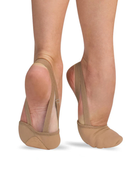 These half soles are made of stretch canvas feature an adjustable elastic ankle strap with silicone for extra grip. Pleated front give a ballet line without the heel. Suede sole.