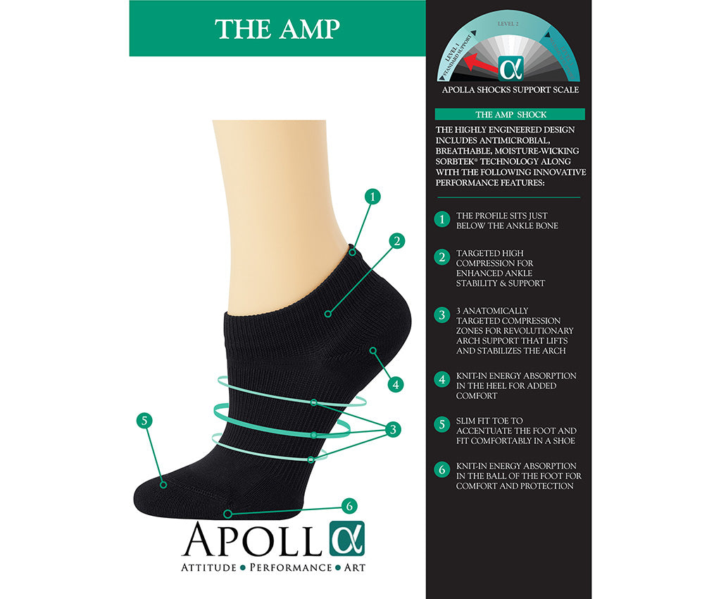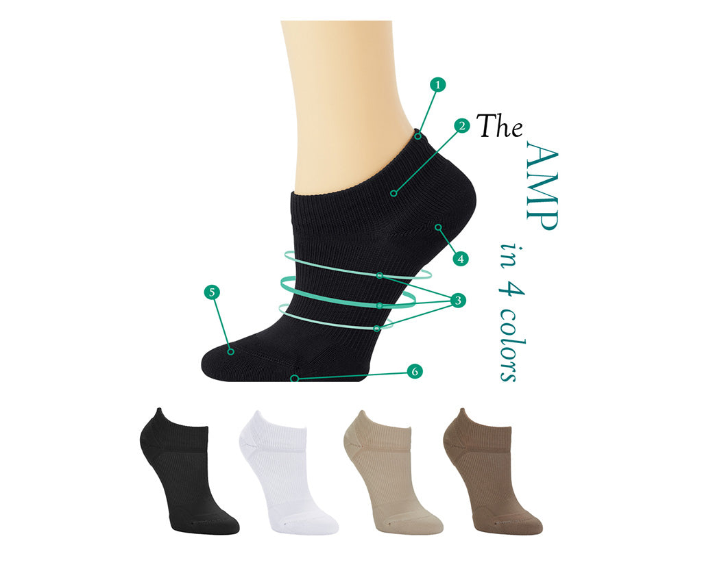 The Amp Shock is beyond a no-show sock. The Amp gives you arch support like nothing you have tried before. The low profile and traction on the ball of the foot AND heel allows it to replace a jazz shoe. or your barre socks. It can also be used in non-traction for everyday wear, in tap shoes, or cross-training.