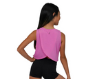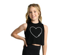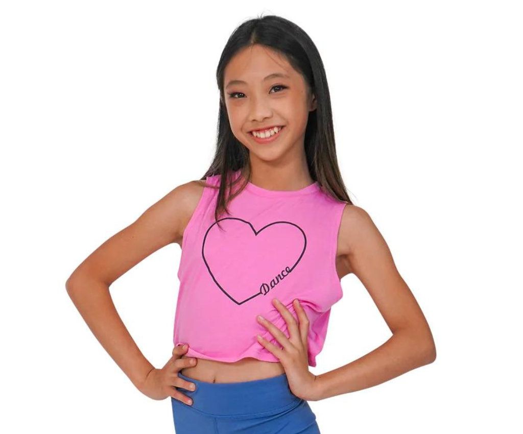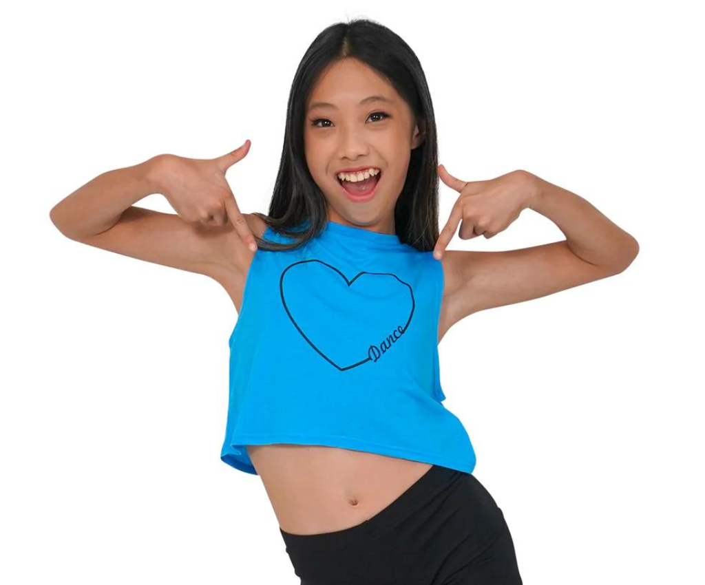 This Danznmotion tank is a plush feel viscose crop length cotton blend tank. Features a screen print with white heart design and the word "Dance". Cute overlap back design. Great top over a fitted dance top.
