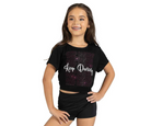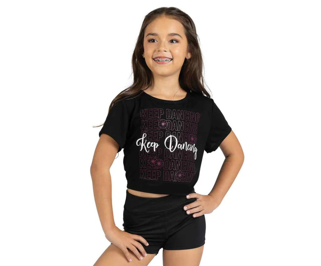 Crop t-shirt with open back and functional tie waist detail. Features stacked repeat block print, Keep Dancing with bold pink script on top.
