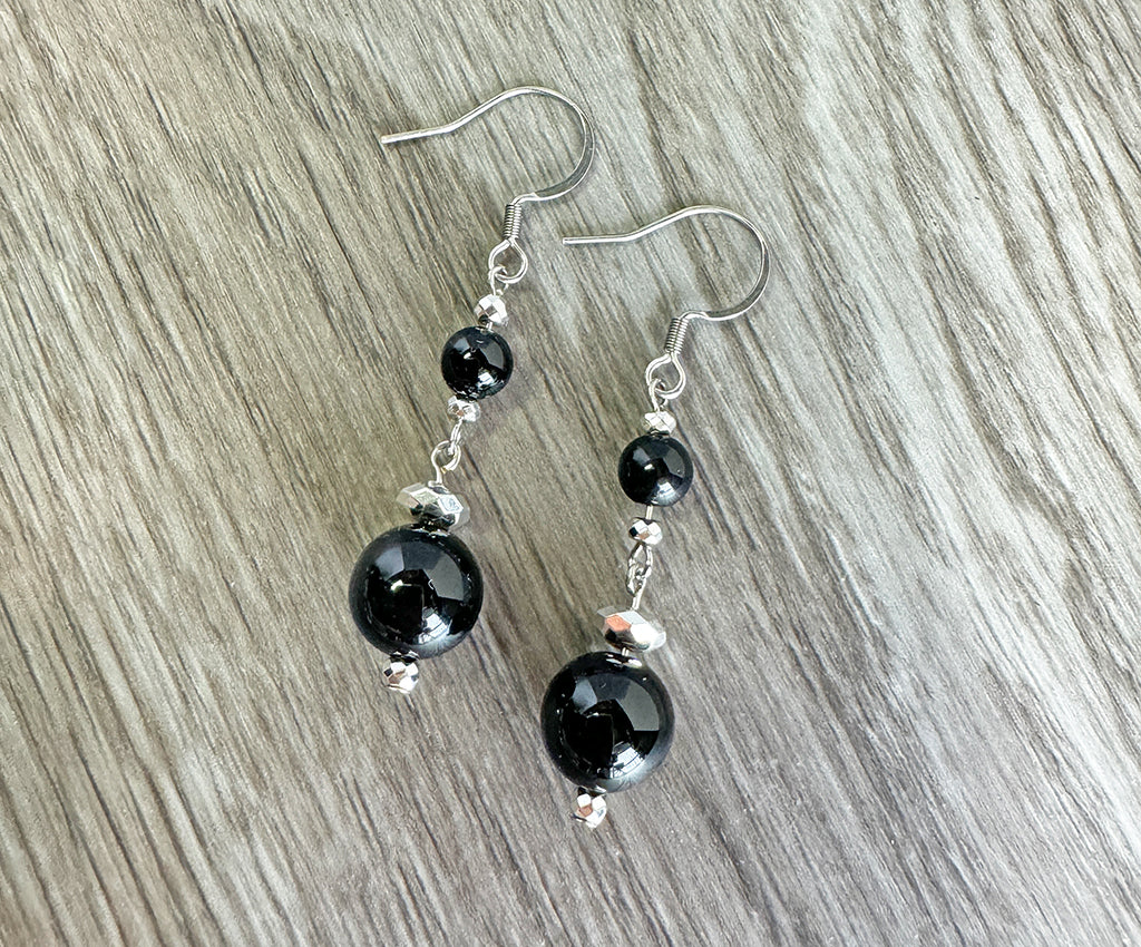 These fun dangle earrings were inspired by New Years Eve and elegant holiday parties. They are handmade from natural black onyx gemstones and bright silver electroplated hematite gemstones. Finished with surgical steel ear hooks.
