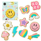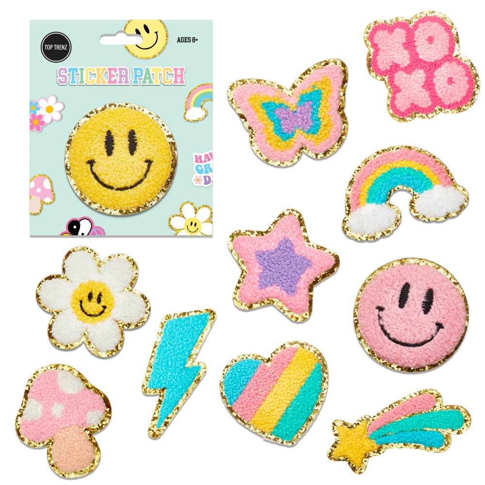 Customize your bag with the super cute self adhesive chenille sticker patches. They are the perfect way to add personality and flare. Made from high quality soft chenille fabric in fun colours with a gold glitter boarder with an easy peel and stick application. Great for tweens!