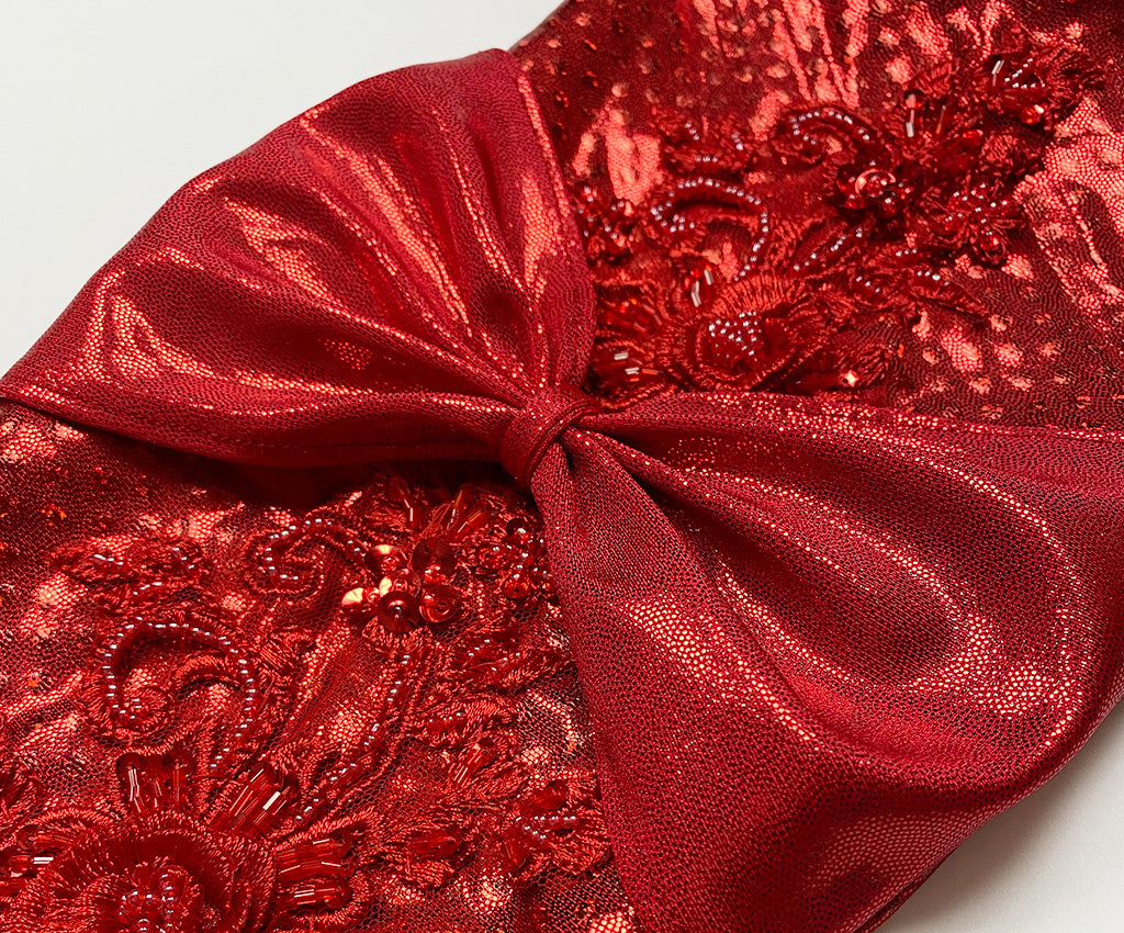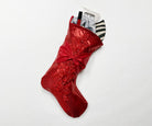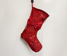 AWESOME GIFT! Also an amazing Christmas decoration. Quality made fully lined shiny red dot mystique stocking with Large bow & hand sewn floral beaded applique. This one is definitely a winner. Fill with gifts for that special someone. Attached loop to hang by the mantel or on the tree.