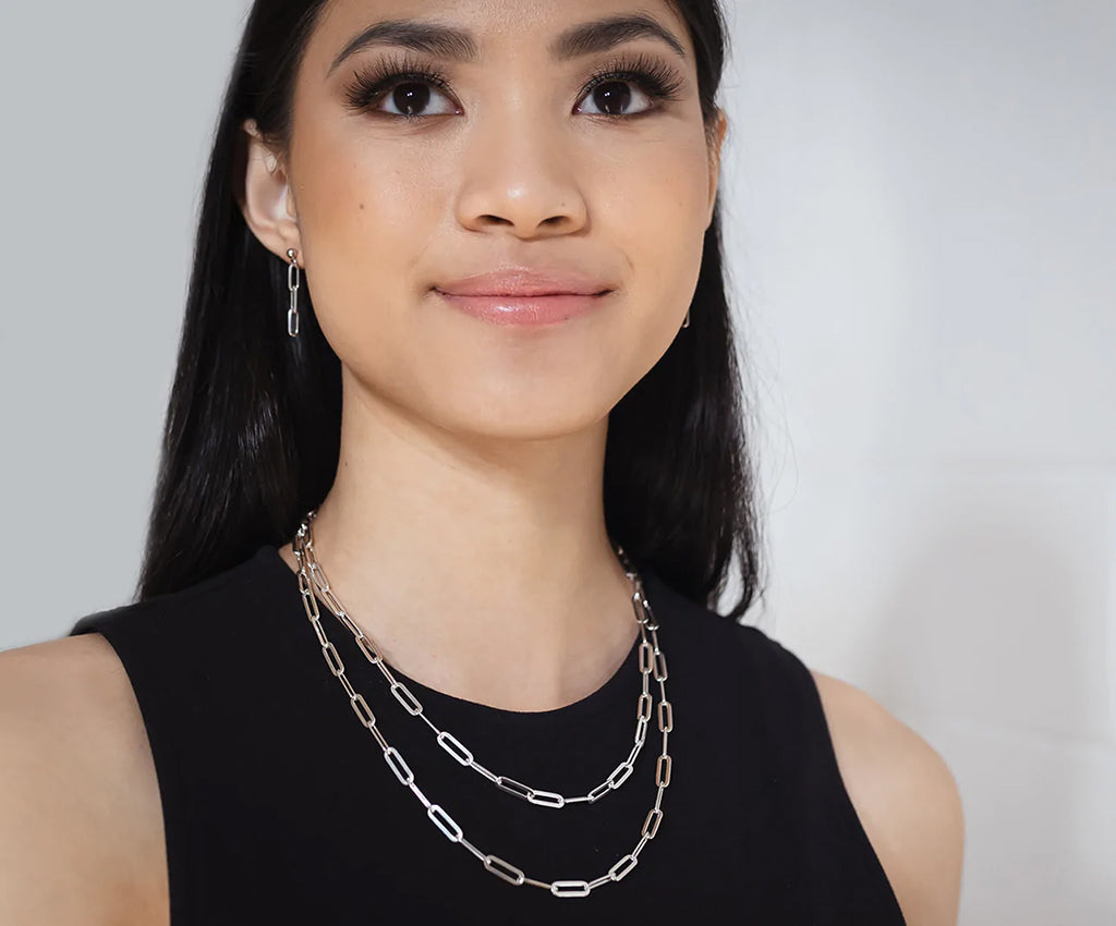 These paper clip style chains by Rhythm Jewellery are pretty as a stand alone necklace and also great for layering. This adjustable style necklace can be hooked into any link along the chain to create different lengths. Complete the look with the matching Connection chain earrings. create your own style by double layering your chain and wearing it on your wrist.