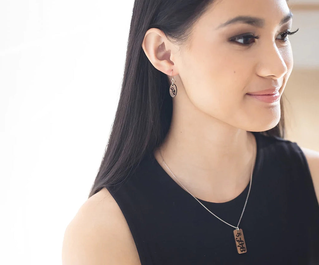 The warm glow of Canadian Walnut takes center stage on this sterling silver accented earrings. A darkly engraved tap shoe contrasts the richly grained walnut creating the perfect accessory for any tap dance lover.