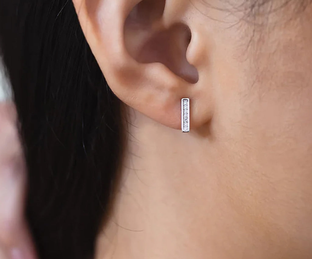 Inspired by the sleek edges of the barre, with a little extra added sparkle. The At The Barre Signature earrings make a statement everywhere they go. A line of faceted cubics sparkle against the graphic sheen of sterling silver, making a stylishly bold statement for any occasion. Great for dancers or non-dancers alike.