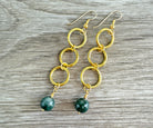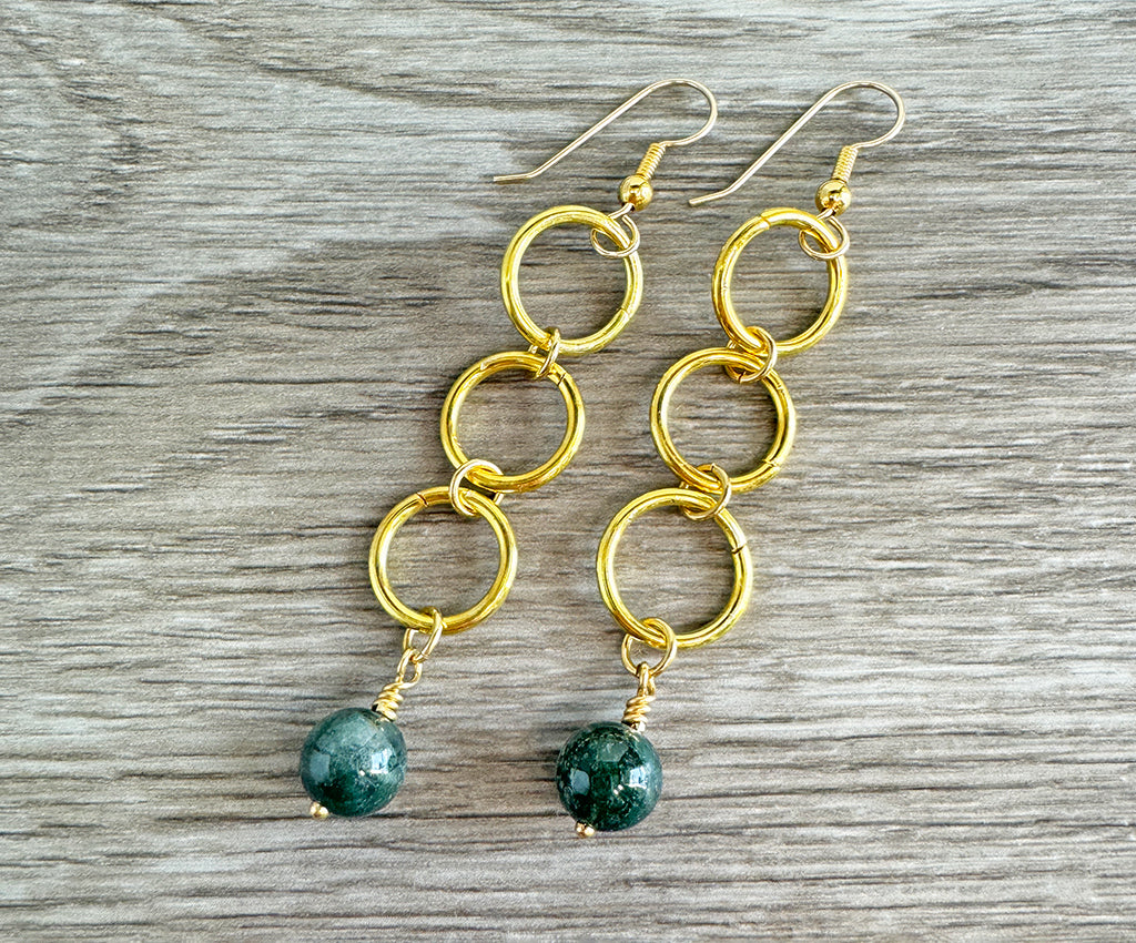 These playful handmade dangle earrings feature 3 gold plated linked loops. A single 8mm moss agate gemstone hangs at the bottom to add a little colour. Finished with 14kt gold filled ear hooks. Perfect piece to add to your holiday outfit.
