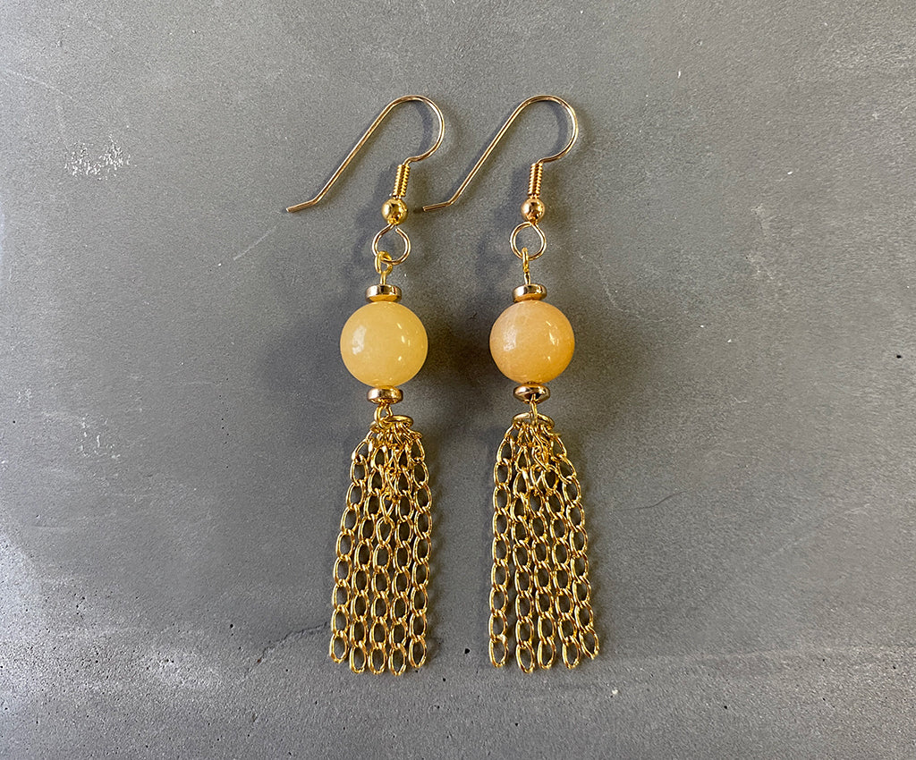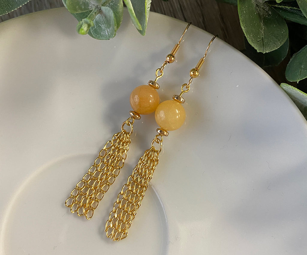 These simple and classic tassel earrings feature a 10mm honey jade semi-precious stone. Gold electroplated hematite accents and gold plated chain tassel complete the look. Dangle length is approximately 2 3/4”