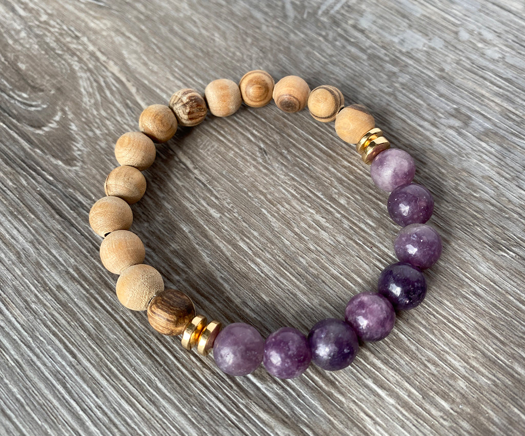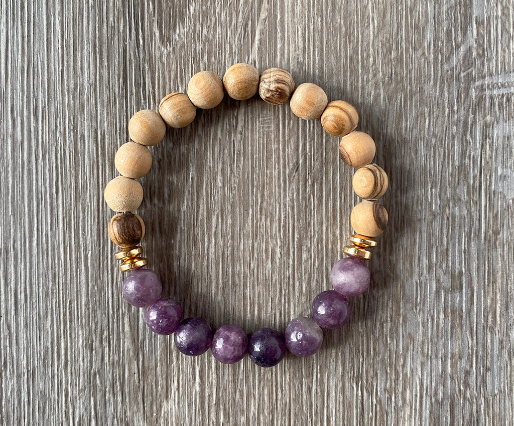 This gorgeous bracelet features 8mm raw matte olive wood beads, hand carved by a family from Bethlehem. Highlighted with 8mm lepidolite stones and accented with gold electroplated hematite spacer beads.